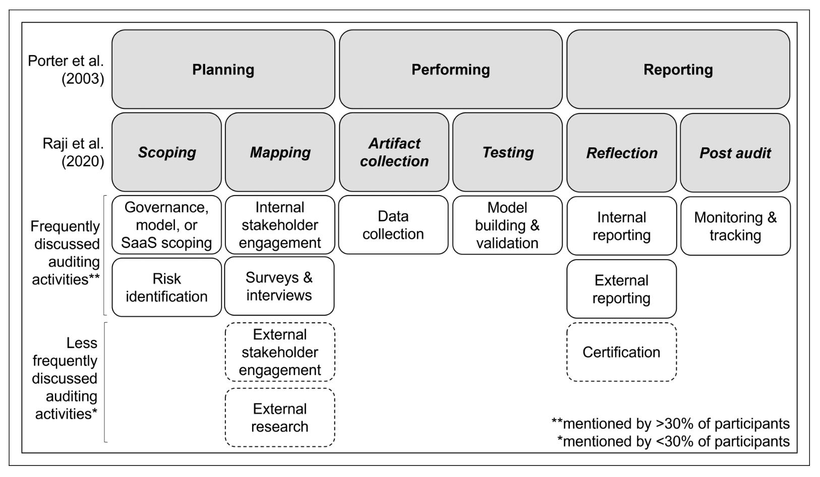 Schiff et al have mapped AI ethics audit activities discussed by the participants of their study against existing auditing frameworks: