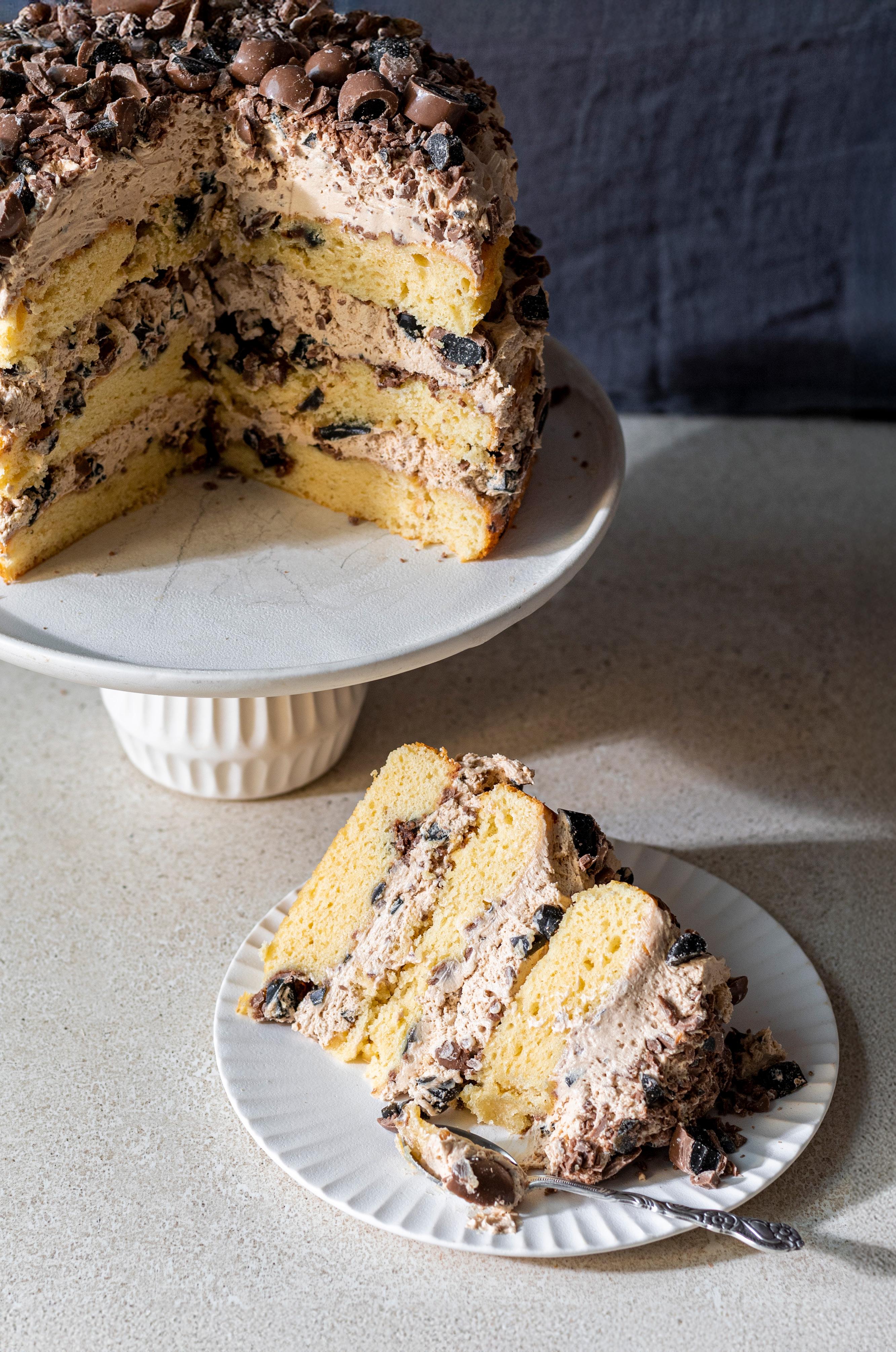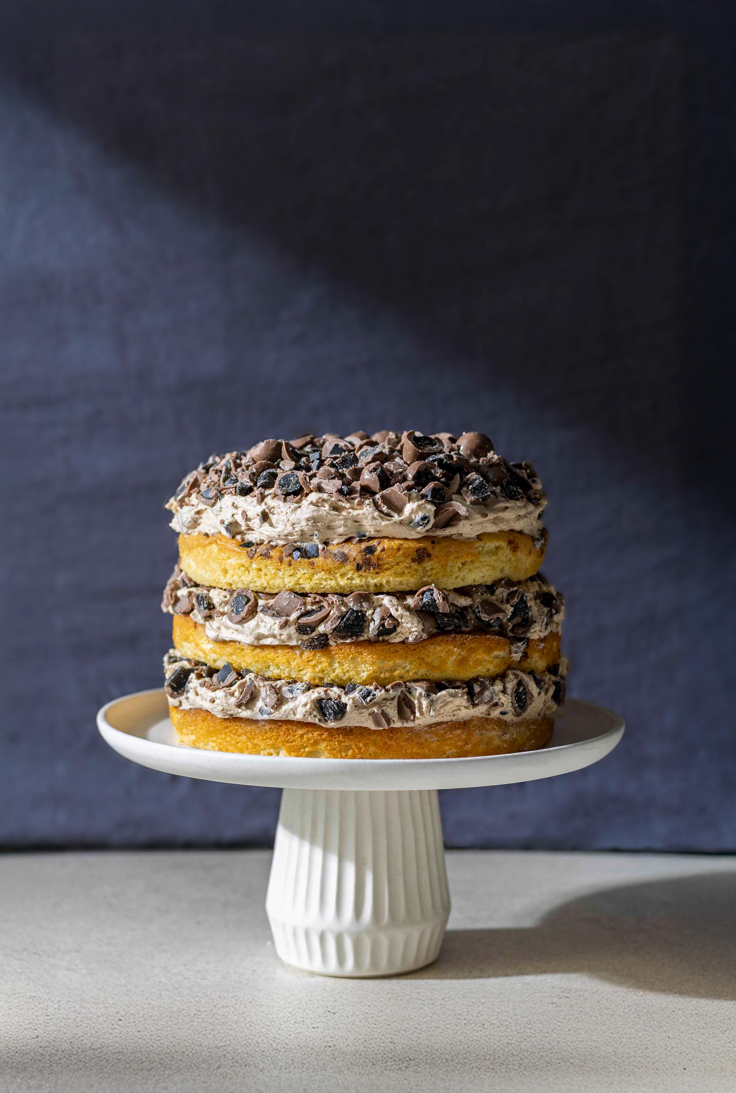 Eitt Sett bita og dreifið yfir kremið. Endurtakið með næstu tvo kökubotna.