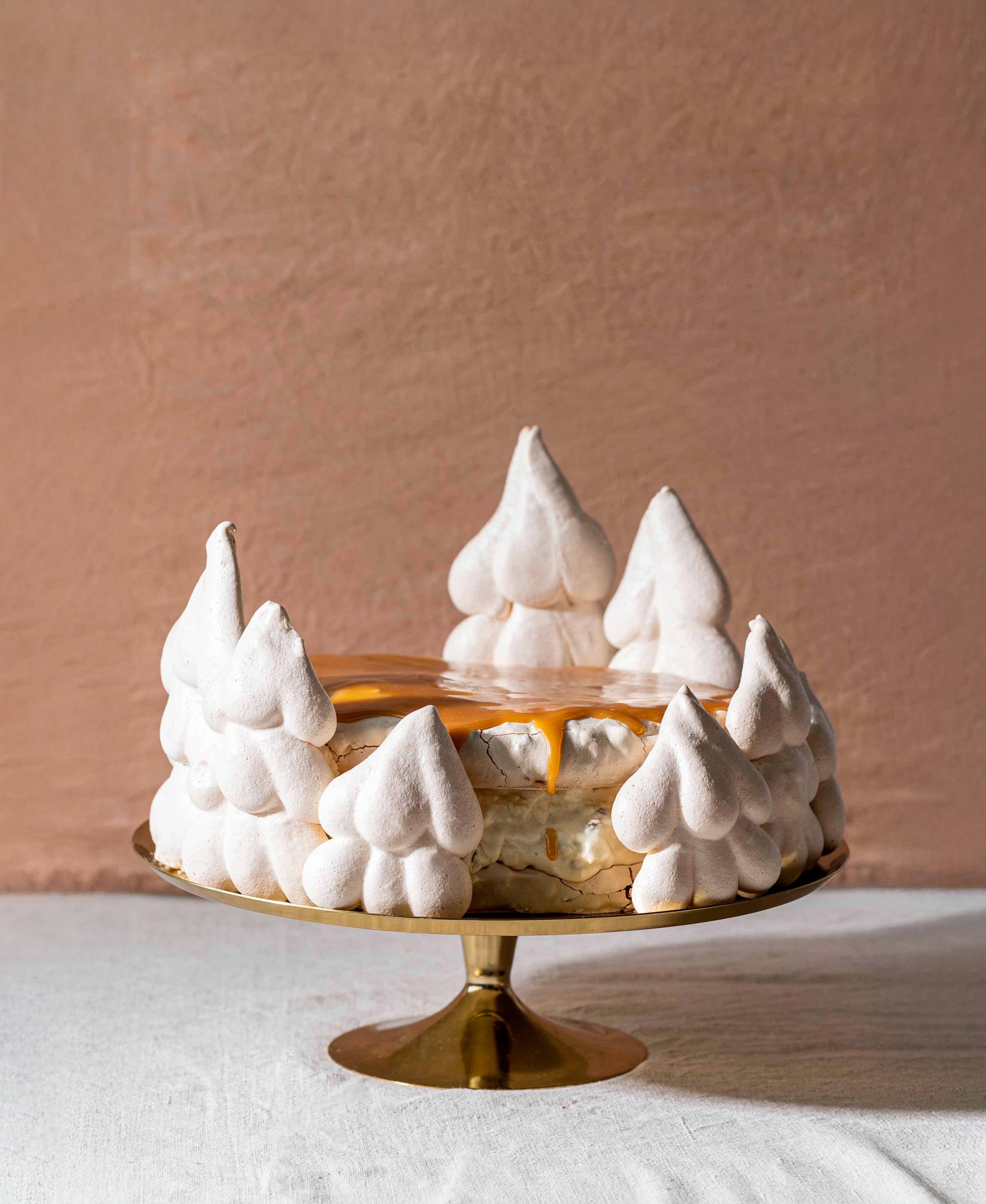 4. Útbúið jólatré með því að þeyta saman eggjahvítum, cream of tartar, salti og sykri þar til stífir toppar myndast. Setjið í sprautupoka með stórum opnum sprautustút og sprautið tré, bæði 2 “hæða/greina” og 3 “hæða/greina” á smjörpappír og bakið í 30 mínútur við 170°C og blástur.