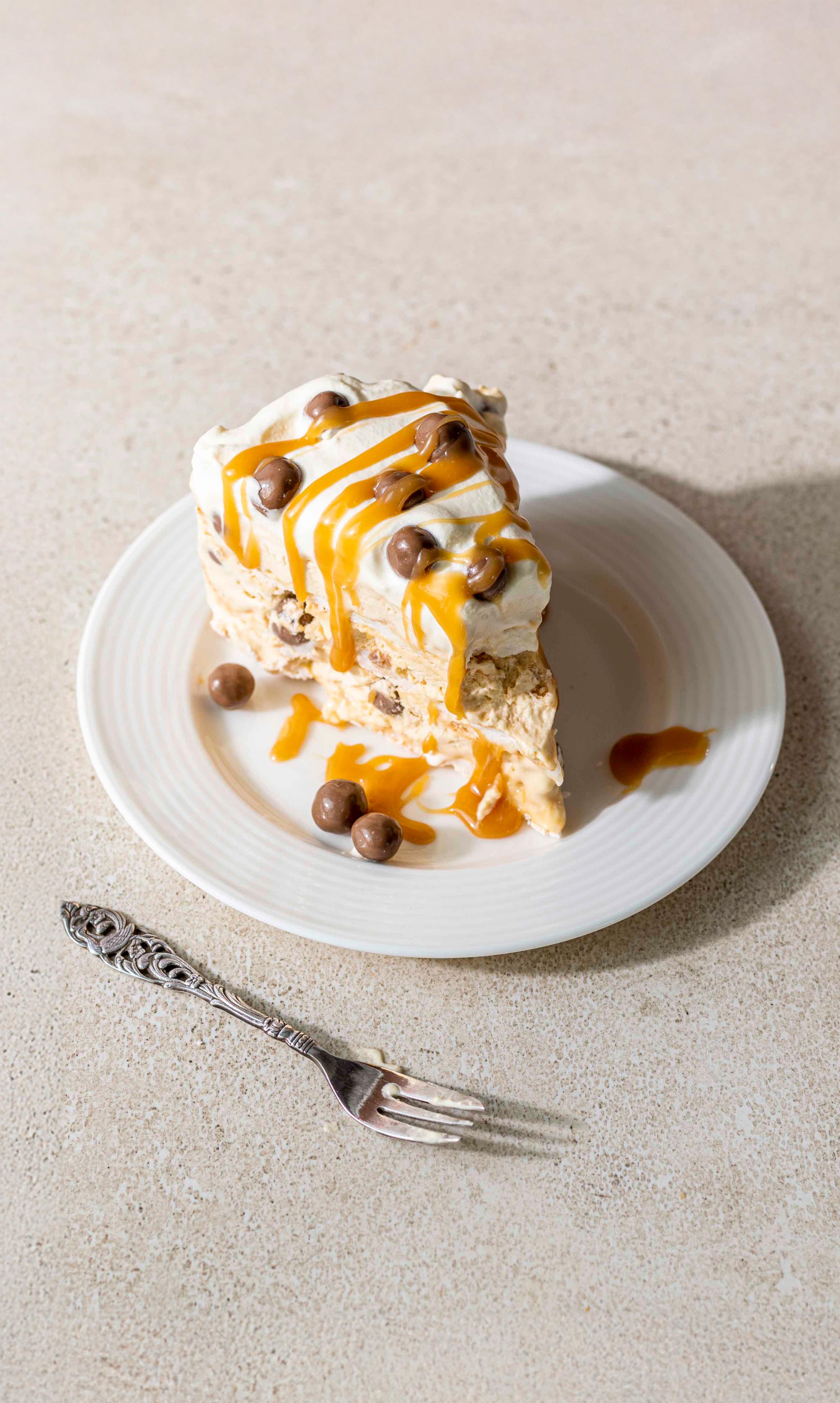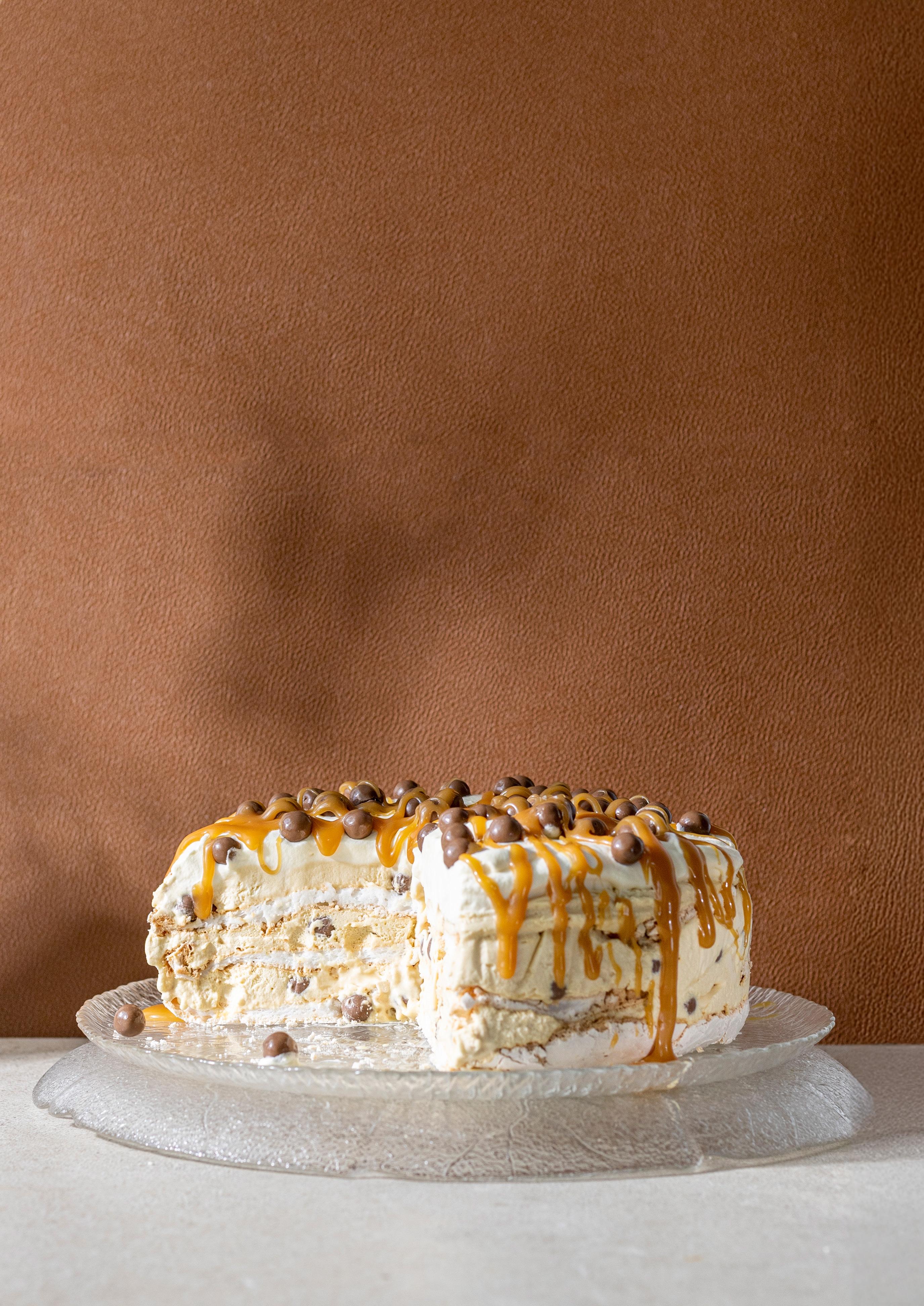 7. Hellið deiginu í formið yfir kexblönduna, sléttið toppinn á kökunni og setjið aftur í frystinn í 6 tíma eða yfir nótt.