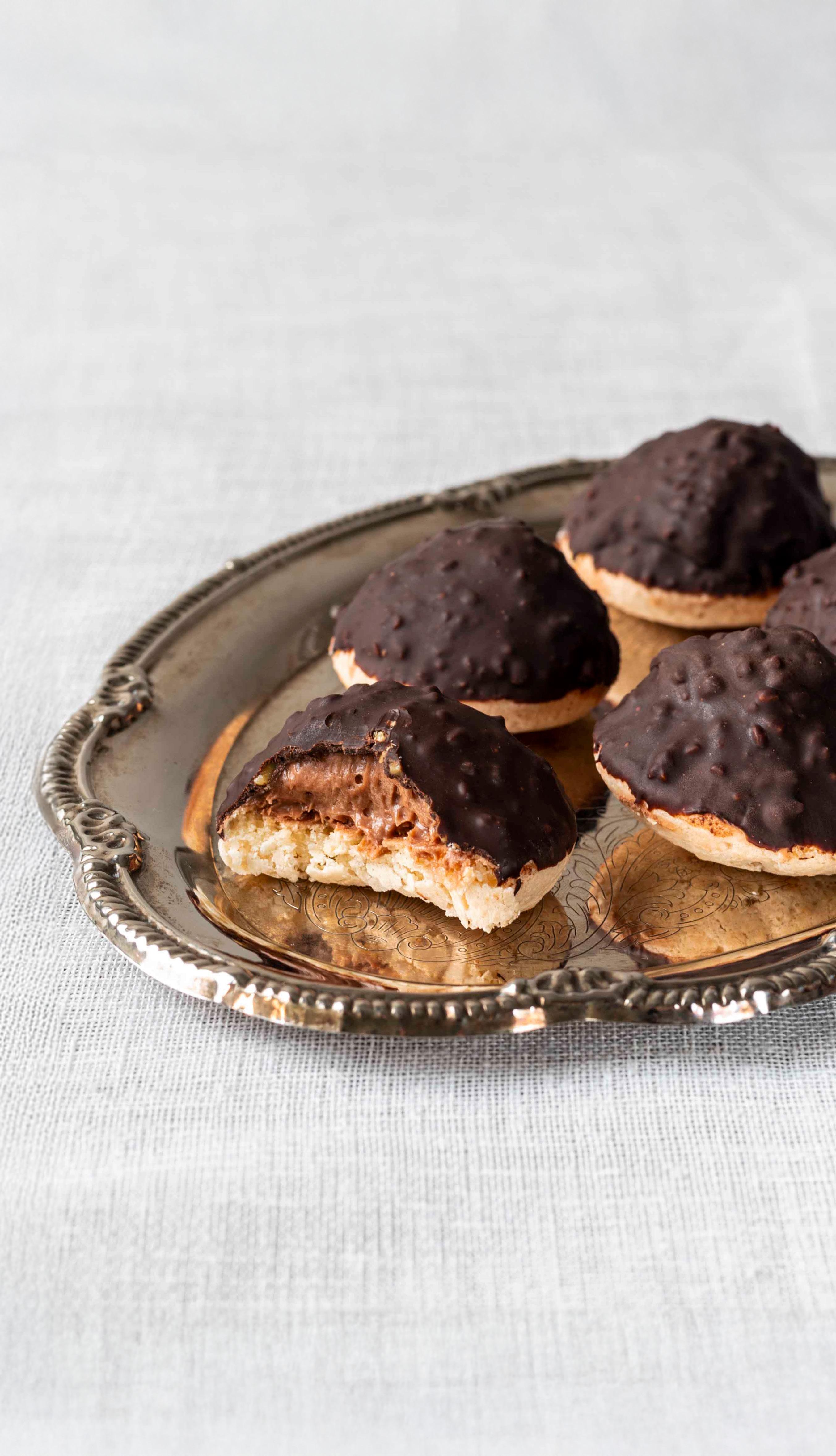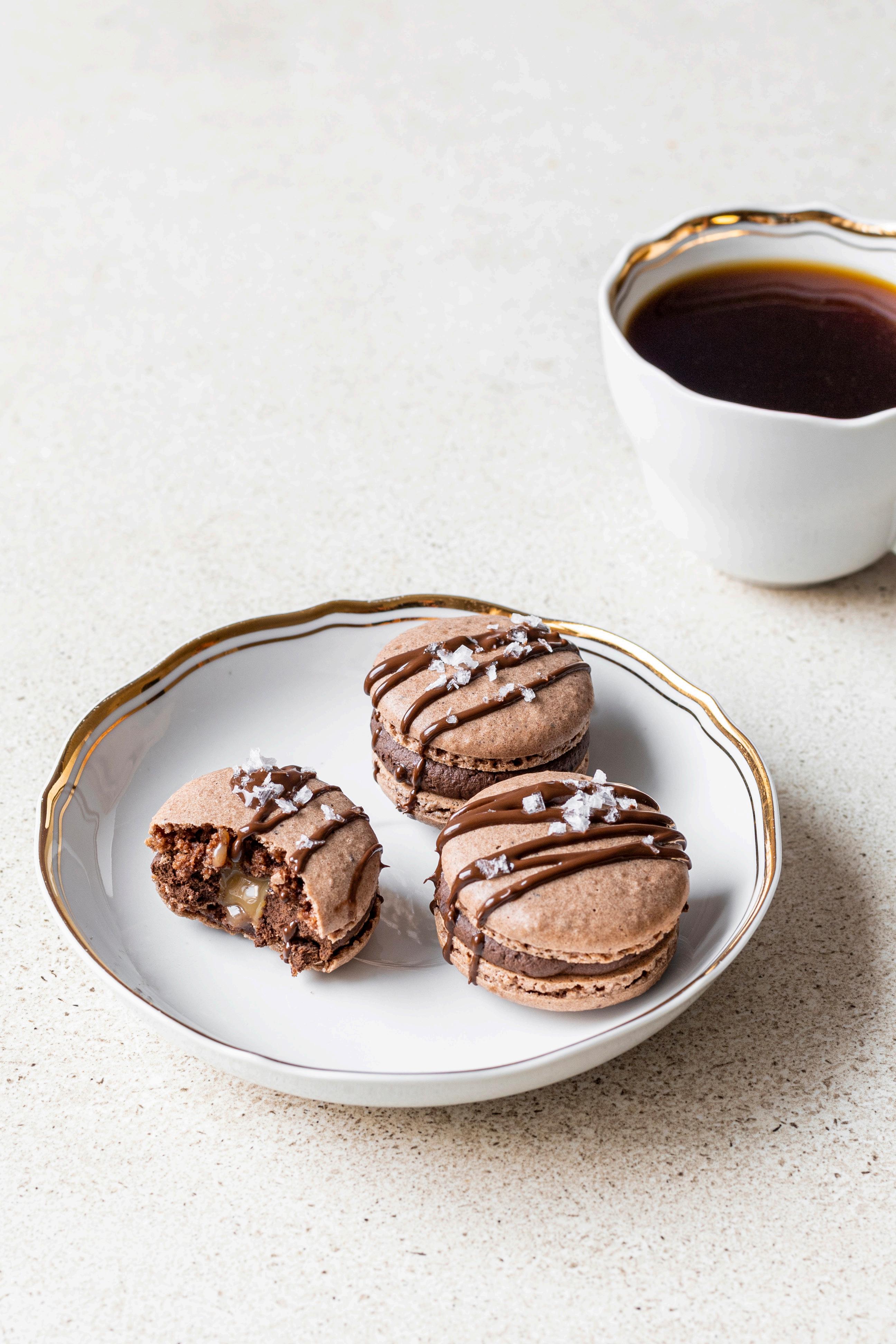 13. Parið saman skeljar sem eru jafn stórar og leggið á borð með sléttu hliðina upp. Setjið súkkulaði fyllingu á ytri hring á eina skel og svo karamellufyllingu í miðjuna. Lokið kökunum með annarri skel.
