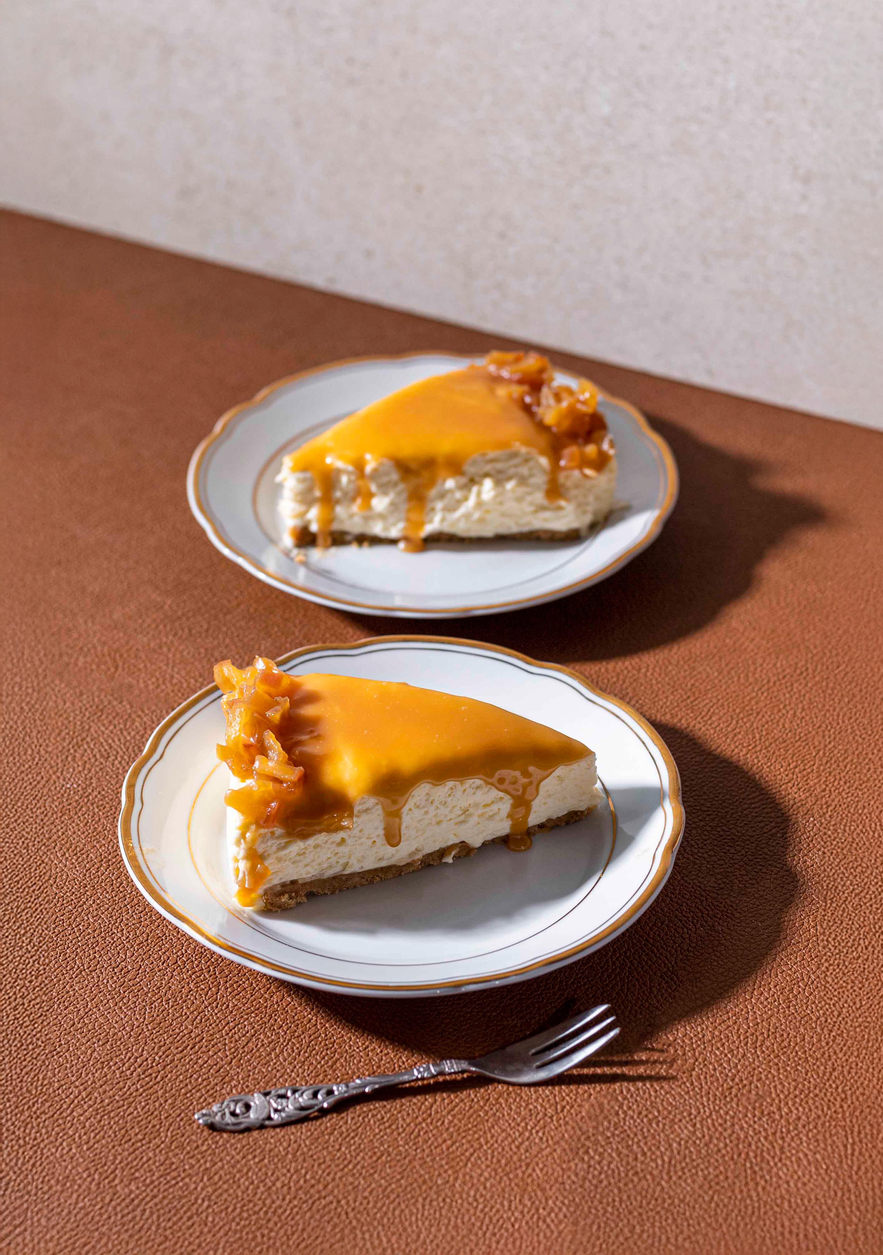 10. Takið kökuna út úr frystinum og setjið brædda karamelluna í miðjuna á kökunni og dreifið úr. Raðið karamellulegnu eplunum á úthring kökunnar.
