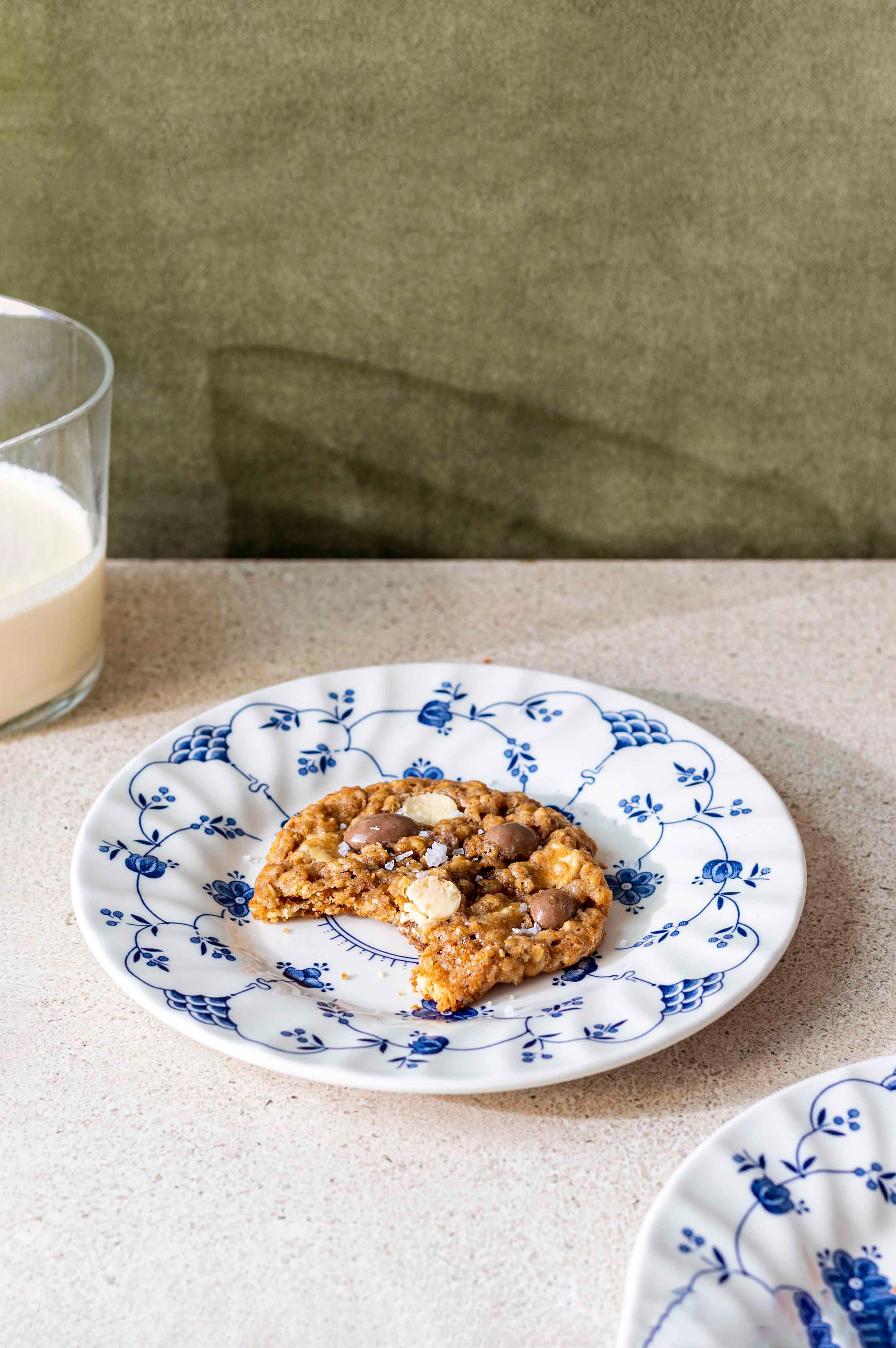 3. Í aðra skál blandið saman hveiti, kanil, lyftidufti, matarsóda og salti. Blandið því varlega saman við sykurblönduna. Bætið haframjölinu, hvítu súkkulaðidropunum og súkkulaðirúsínunum saman við og blandið saman þar til allt hefur samlagast.