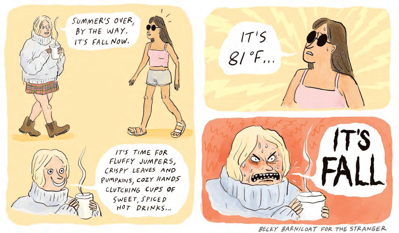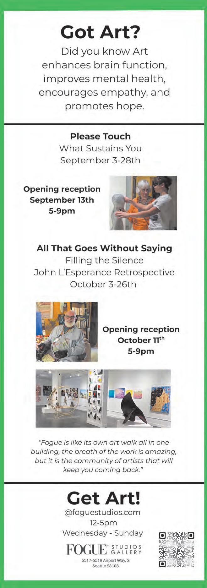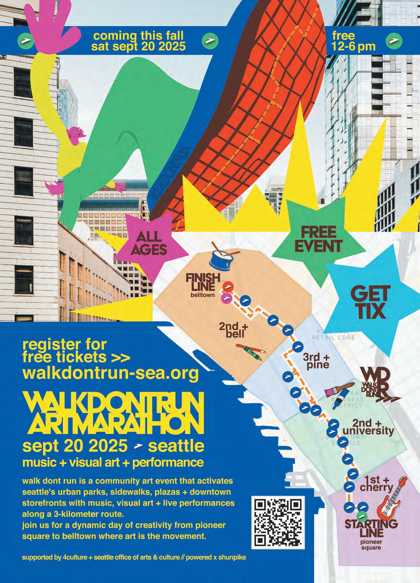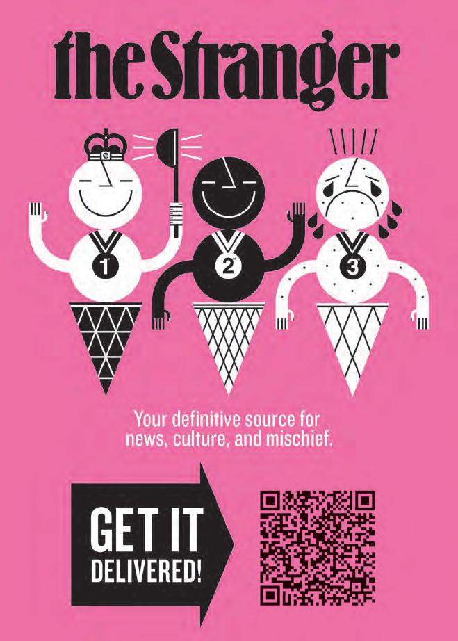 We also have guides to help you choose your own art adventure when it comes to: NWFF’s Local Sightings film fest (pg. 21), all the neat things local theaters have in store for fall (pg. 55), the best visual art happening outside of galleries (pg. 45), local record releases that rip (pg. 61), upcoming local(ish) books we’re excited about (pg. 31), and the very best late-summer-in-Seattle eats on pg. 69 because don’t forget, summer ain’t over until the strike of September 22. And even then, I say the line between summer and fall is also whatever you make it to be, rebel.