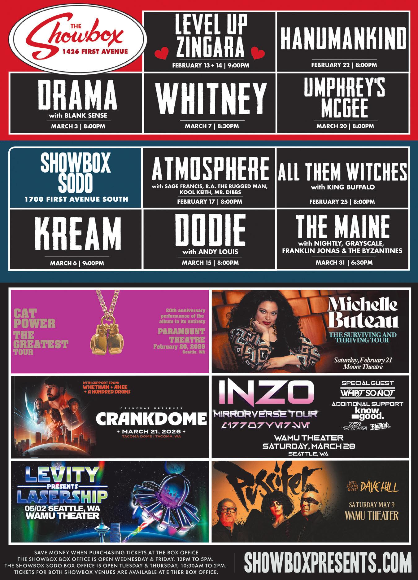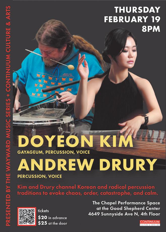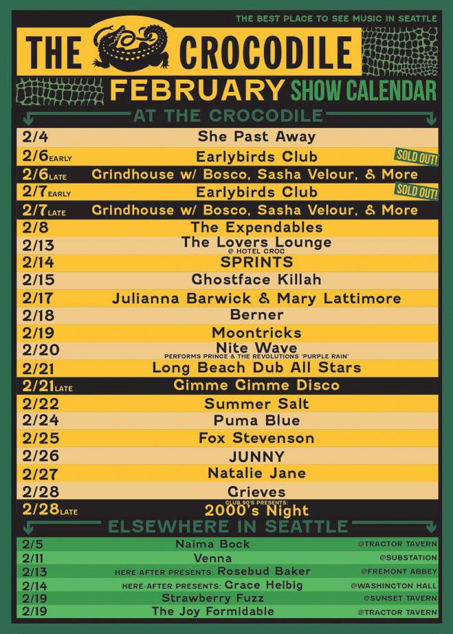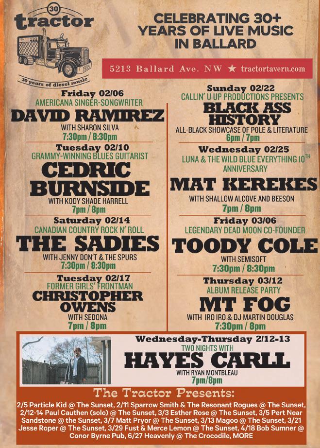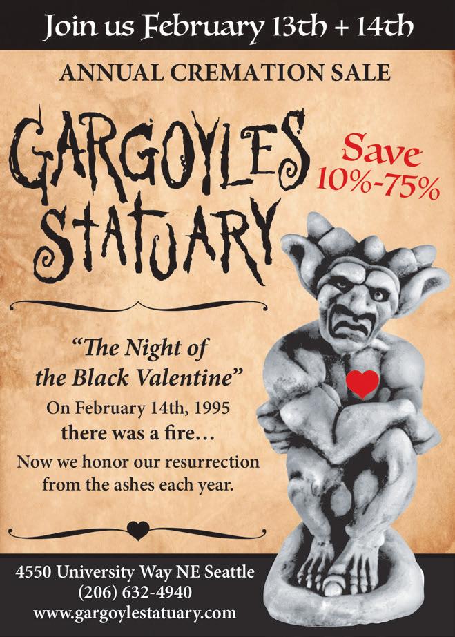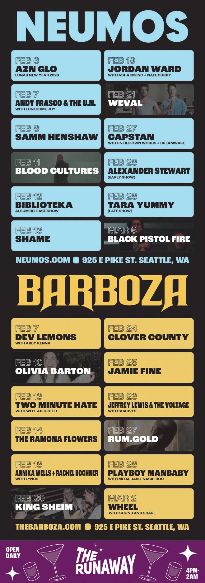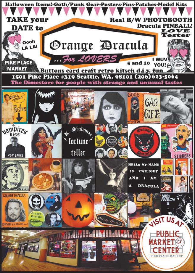 ceremonial artist Mugga Rose (formerly KOOK Teflon), who recently returned to Seattle. Shamanic arts throat singer Soriah will cultivate otherworldly vibrations, followed by an occult performance by storyteller and psychic Doña Macabra. Meagan Angus, Hannah Haddix, and Gabriela of All Gates Within will impart stories and spoken word, Mugga Rose will read from her book, and Jessica Henry and CURRĄŊ will curate a market full of “unique, peculiar, one-of-akind creations” from artists. The night is also in part a tribute to the late “fire-tongued, spell-bright, never forgotten” witch Jaguar Bullet. (Rabbit Box Theatre, 7–10 pm, all ages) JULIANNE BELL