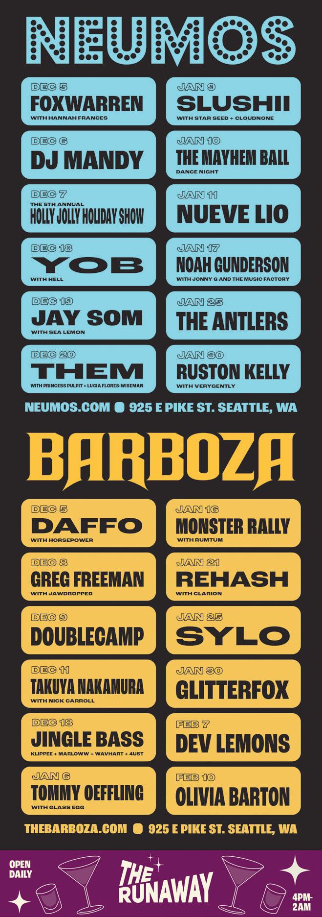 But we didn’t want to just leave 2025 with complaints, so we added a couple love letters for you, too. Senior Staff Writer Charles Mudede wrote about how Vangelis’s score for Blade Runner—which will soon be performed by the Seattle Symphony—used synthesizers to create an impossibly expansive city. Stranger contributor Meg van Huygen made you a list of the very best holiday drinks around the city, from taverns to cocktail bars. Michael Wong offers the official Asian Verified Ins and Outs of 2025, and our Books Correspondent, Katie Lee Ellison, finally ranked the best books of the year. But just in case you dare mistake us as unserious, Staff Writer Nathalie Graham dug into a school board race in Tumwater that captures the conservative fervor against trans athletes in Washington. And now that the race for the Mayor’s office is over, we learned what it takes to run a mayoral campaign as a community organizer.
