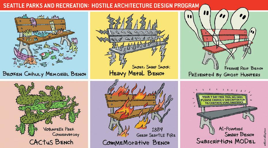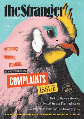 Actually, a lot. After enduring nine intense months of campaigning, we elected a new mayor, two new city council members, and a new city attorney, and as far as we can tell, none of them are secret Republicans. We got our very own women’s hockey team. We saved a major bus lane that was on the chopping block. The Mariners got the closest they’ve ever gotten to the World Series. An orca calf survived long enough to be socially integrated into its pod. The Pastry Project opened a bakery window. Mount Rainier didn’t erupt. And we have 11 shiny Stranger issues in the bag. But amidst all that goodness, we still have some bones to pick. And in these pages, you’ll find The Stranger ’s inaugural Complaints Issue, a non-exhaustive (exhausted, exhausting) list of everything that grinds our gears about Seattle. (pg. 15) This isn’t the transplant bitch-fest you see every two weeks on TikTok. We love this city. And we love it enough to want better for it. We want parks that seem like they actually like people! We want things to be open outside of banking hours! We want grocery stores that aren’t part of the