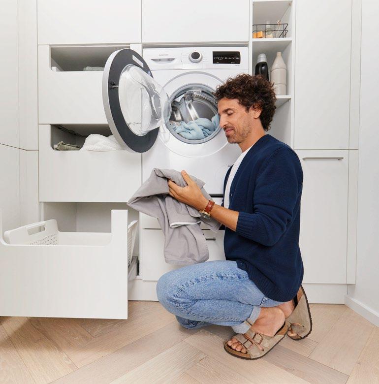 It's the place for everything that has no home elsewhere or spoils the look: the utility room. It's where you can keep your vacuum cleaner, ironing board, washing machine, dryer, laundry baskets, deposit bottles and much more besides. Thanks to its space-saving organisation systems, the utility room makes housekeeping more efficient and provides the key to creating a home that's altogether modern, tidy and focused on aesthetic appeal. Anyone cleverly integrating their utility room, as in our composition, looks at a closed, homogeneous front in the kitchen: hidden behind it is the entire utility room, providing space for a variety of household objects and activities.