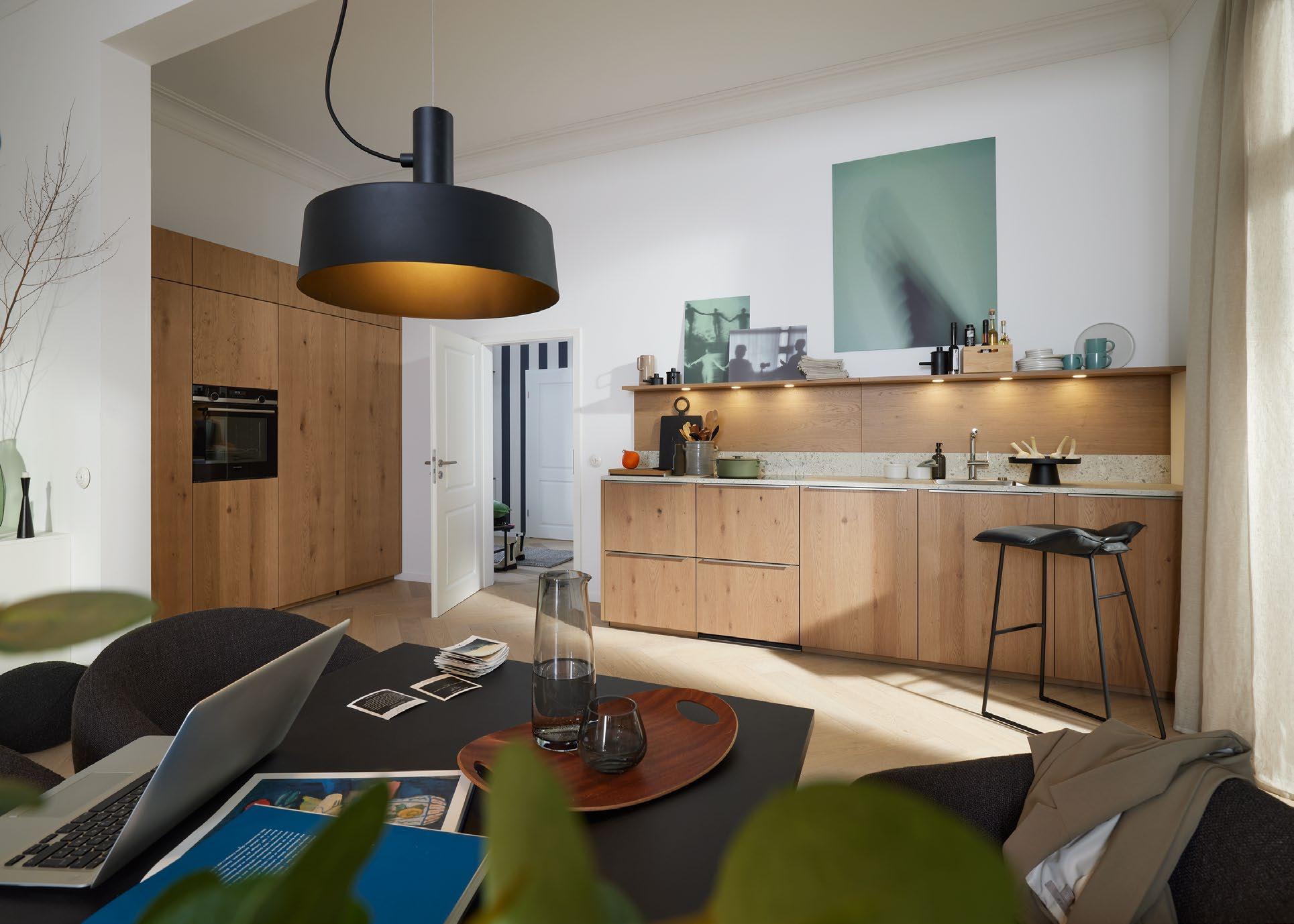 How can period charm be retained while at the same time enhancing practical utility? Not only calling for a sympathetic approach and an adept hand, this first of all demands compelling ideas. For instance, a real-wood kitchen front emphasises the character of the building and creates a warm and inviting atmosphere. At the same time, it leaves a rustic feel, while the absence of wall cabinets creates a look that reflects the spirit of modern design.