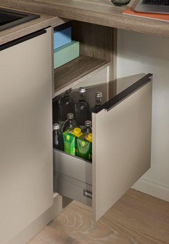 Use the space under the counter as well: a pull-out keeps contents neatly organised and easy to find. Bottles and Tetra Pak cartons for example.