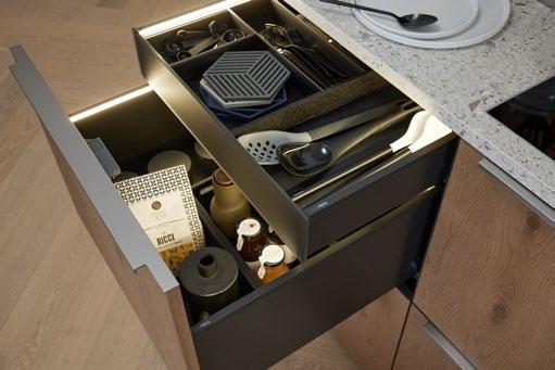 1 The neoBOX drawer and pull-out system brings exquisite design to the cabinet interior and is one of the elements every nolteneo kitchen comes with. The narrow side frame appeals for its simple elegance – nothing spoils the look. By way of option, the neoBOX can also be used to illuminate the pull-outs. Fitted on the right and left of the drawer side frame, the LED lighting strip conjures a very distinctive atmosphere and shows where everything is when the drawer is opened.
