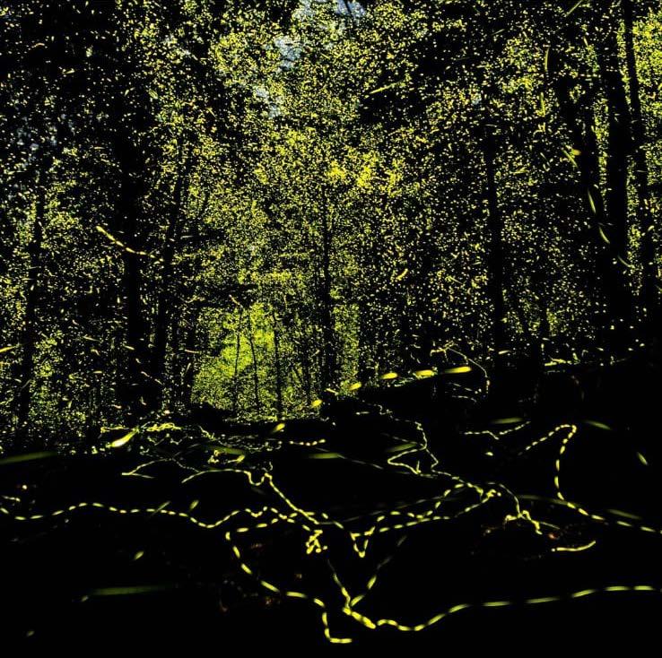 Les lucioles synchrones mâles clignotent à l’unisson sur les cimes des arbres pendant des heures pour attirer les femelles. Il est fascinant de voir comment elles se coordonnent alors qu’ils sont en fait en compétition les uns avec les autres. Après des heures de clignotement synchronisé, ils descendent à la recherche de partenaires potentiels. Elles laissent des traînées artistiques sur le sol lorsqu’elles volent à basse altitude.
