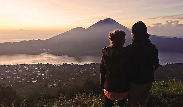 ”Un de nos plus forts souvenirs, c’est le mont Batur (1717 m). Nous ne pouvions pas partir en voyage à Bali sans nous y rendre ! À deux heures du matin, nous quittons Ubud, chaudement habillés, lampe frontale en poche, impatients d’arriver au sommet pour voir ce lever du soleil dont on nous a tant parlé. La montée, en compagnie de Putu, notre guide francophone, et de plusieurs guides locaux, ne présente aucune difficulté majeure. Là-haut, la magie d’un magnifique ciel rouge commence à opérer. Alors que le lac Batur apparaît en contrebas, le mont Abang se dessine et se dévoile sous nos yeux. Par chance, ce matin-là, le temps clair nous permet d’apercevoir le sommet du mont Rinjani sur l’île de Lombok. Une vue panoramique grandiose sur des paysages majestueux : sans doute la plus belle manière de commencer notre journée à Bali.”