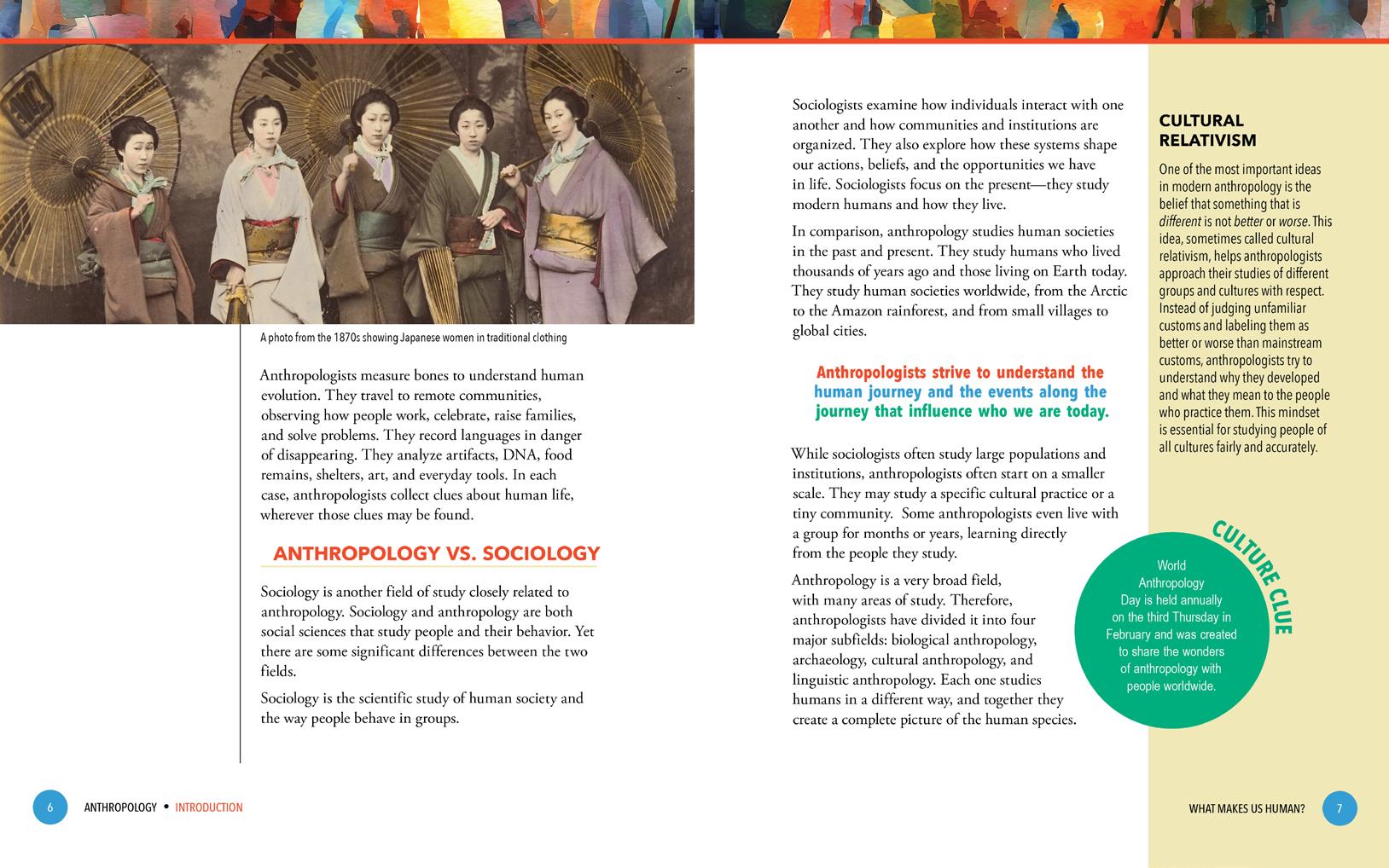 Anthropology is the study of the development of human society. In Anthropology: The Science of Being Human, young anthropologists explore several kinds of anthropology, including biological anthropology, archaeology, cultural anthropology, and linguistic anthropology while examining significant items or events that show moments in time when the human race adapted to a changing world in a way that exemplifies the human experience.