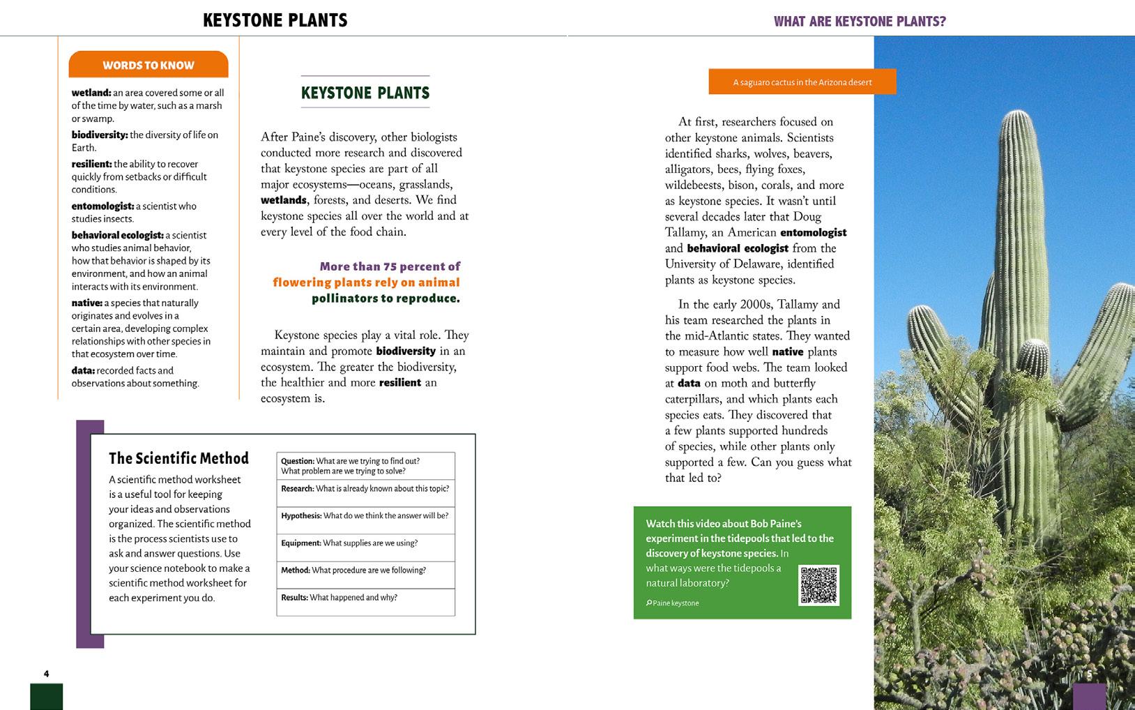 Health and Biodiversity, young botanists examine the keystone plants that make the difference between a thriving ecosystem and a collapsing one. Oak trees, baobab trees, Brazil nut trees, mangroves, saguaro cacti, and certain flowers, grasses, and fungi are all considered keystone species that other species depend upon.