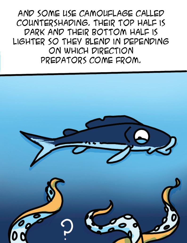 countershading: a camouflage adaptation in which animals are dark on top and light on the bottom.