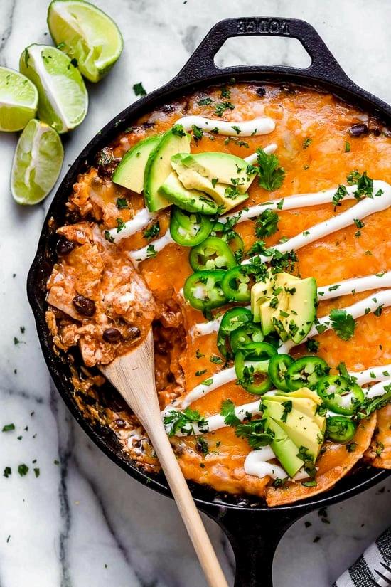 Let cool slightly, then top the enchiladas with sour cream, jalapeños, and cilantro (if desired) and serve directly from the skillet at the table