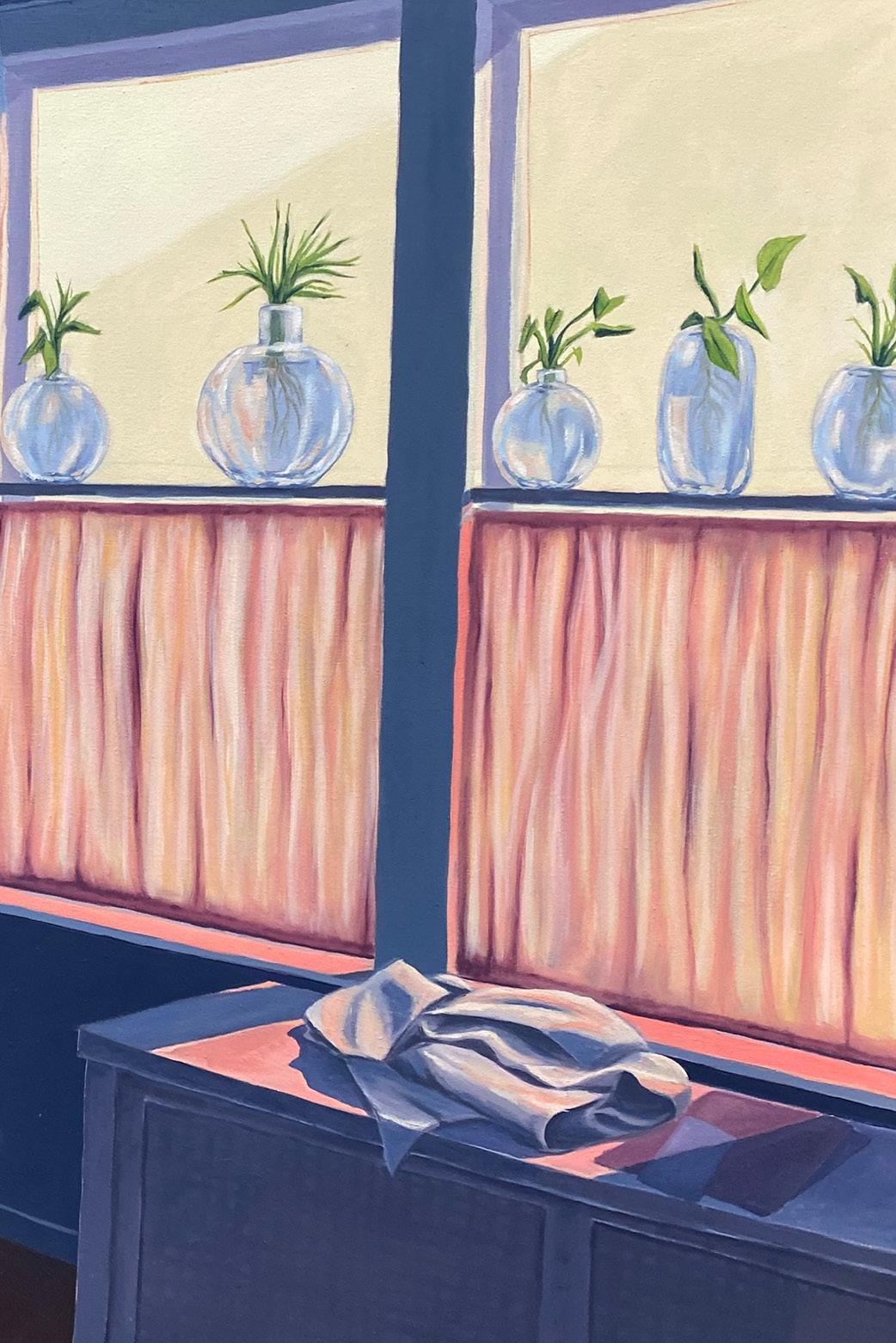 Olivia accepting the introverted fate claiming the wall where a faded daffodil is being restored.