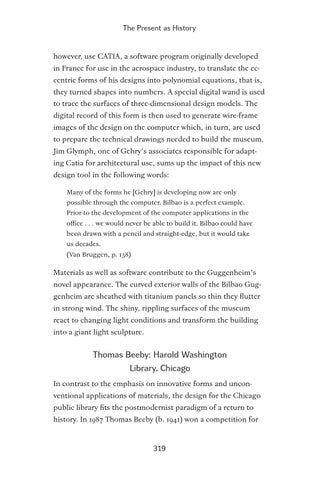 The Present as History however, use CATIA, a software program originally developed in France for use in the aerospace industry, to translate the eccentric forms of his designs into polynomial equations, that is, they turned shapes into numbers. A special digital wand is used to trace the surfaces of three-dimensional design models. The digital record of this form is then used to generate wire-frame images of the design on the computer which, in turn, are used to prepare the technical drawings needed to build the museum. Jim Glymph, one of Gehry’s associates responsible for adapting Catia for architectural use, sums up the impact of this new design tool in the following words: Many of the forms he [Gehry] is developing now are only possible through the computer. Bilbao is a perfect example. Prior to the development of the computer applications in the office . . . we would never be able to build it. Bilbao could have been drawn with a pencil and straight-edge, but it would take us decades. (Van Bruggen, p. 138)