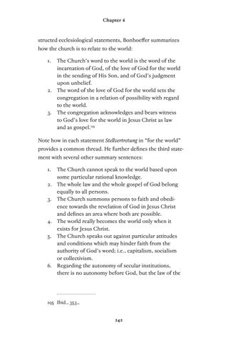structed ecclesiological statements, Bonhoeffer summarizes how the church is to relate to the world: 1. The Church’s word to the world is the word of the incarnation of God, of the love of God for the world in the sending of His Son, and of God’s judgment upon unbelief. 2. The word of the love of God for the world sets the congregation in a relation of possibility with regard to the world. 3. The congregation acknowledges and bears witness to God’s love for the world in Jesus Christ as law and as gospel.195 Note how in each statement Stellvertretung in “for the world” provides a common thread. He further defines the third statement with several other summary sentences: 1. The Church cannot speak to the world based upon some particular rational knowledge. 2. The whole law and the whole gospel of God belong equally to all persons. 3. The Church summons persons to faith and obedience towards the revelation of God in Jesus Christ and defines an area where both are possible. 4. The world really becomes the world only when it exists for Jesus Christ. 5. The Church speaks out against particular attitudes and conditions which may hinder faith from the authority of God’s word; i.e., capitalism, socialism or collectivism. 6. Regarding the autonomy of secular institutions, there is no autonomy before God, but the law of the