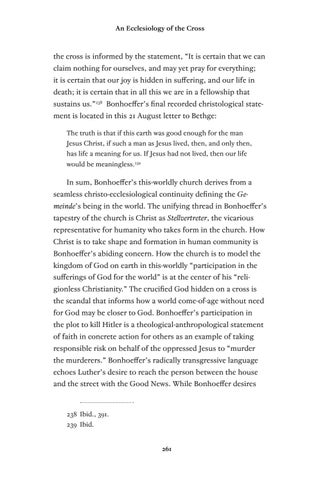 In sum, Bonhoeffer’s this-worldly church derives from a seamless christo-ecclesiological continuity defining the Gemeinde’s being in the world. The unifying thread in Bonhoeffer’s tapestry of the church is Christ as Stellvertreter, the vicarious representative for humanity who takes form in the church. How Christ is to take shape and formation in human community is Bonhoeffer’s abiding concern. How the church is to model the kingdom of God on earth in this-worldly “participation in the sufferings of God for the world” is at the center of his “religionless Christianity.” The crucified God hidden on a cross is the scandal that informs how a world come-of-age without need for God may be closer to God. Bonhoeffer’s participation in the plot to kill Hitler is a theological-anthropological statement of faith in concrete action for others as an example of taking responsible risk on behalf of the oppressed Jesus to “murder the murderers.” Bonhoeffer’s radically transgressive language echoes Luther’s desire to reach the person between the house and the street with the Good News. While Bonhoeffer desires