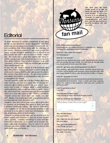 Editorial Hi guys! Welcome to another installment of this thing we like to call Nonsense Humor Magazine! This time around we are focusing on my favorite season of all, fall, and everything that comes along with the changing of the leaves. Winter is rearing it’s ugly head around the corner and we thought it would be nice to reflect on all that autumn has had to offer us here at Hofstra University. We really had a great time putting this thing together and we hope nobody gets as mad us as my mom does when I tell her I have another semester to go untill I graduate. At this point I think my children will graduate from Hofstra before I do. At any rate, we found a bunch of new freshmen who were interested in feeling ostracized by their fellow students and in making stuff they like with people they kinda like and this thing came out of it. We got some excellent new writers and added on photographers who are sure to strengthen our #brand. This fall semester really felt a lot like Hofstra was trying extra hard but not even in a good way mostly just like someone who’s trying to hard to be your friend. Lackmann food is now %5 cheaper which is great because getting diarrhea really should not break the bank! I’m really sorry about that Lackmann joke just because jesus christ on a cross who gives a shit? There’s a goddamn Chipotle across the street don’t you cretins love that shit? Maybe stop buying weed with your parents money and buy yourself some groceries idk?? Anyways, yeah this school year seems like a great time to continue on pretending this place is more than just a glorified community college. We need to continue to come together on Yik Yak to ask somebody where to get adderall, or to ask girls to come over and blow you, or to talk about being afraid of black people. Continue on being just the way you are and be sure to never expand your horizons or step out of your comfort zones, people. Learning new things is scary and was invented by democrats so it’s better not to involve ourselves with new information. Also be sure to be afraid of things you aren’t familiar with! There’s no one on this earth better than you buddy :) 4