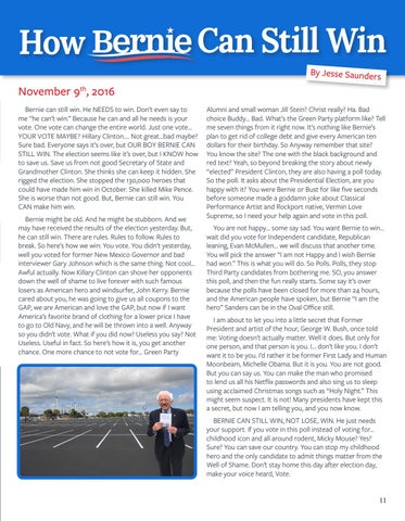 November 9th, 2016 Bernie can still win. He NEEDS to win. Don’t even say to me “he can’t win.” Because he can and all he needs is your vote. One vote can change the entire world. Just one vote… YOUR VOTE MAYBE? Hillary Clinton…. Not great…bad maybe? Sure bad. Everyone says it’s over, but OUR BOY BERNIE CAN STILL WIN. The election seems like it’s over, but I KNOW how to save us. Save us from not good Secretary of State and Grandmother Clinton. She thinks she can keep it hidden. She rigged the election. She stopped the 130,000 heroes that could have made him win in October. She killed Mike Pence. She is worse than not good. But, Bernie can still win. You CAN make him win. Bernie might be old. And he might be stubborn. And we may have received the results of the election yesterday. But, he can still win. There are rules. Rules to follow. Rules to break. So here’s how we win: You vote. You didn’t yesterday, well you voted for former New Mexico Governor and bad interviewer Gary Johnson which is the same thing. Not cool… Awful actually. Now Killary Clinton can shove her opponents down the well of shame to live forever with such famous losers as American hero and windsurfer, John Kerry. Bernie cared about you, he was going to give us all coupons to the GAP, we are American and love the GAP, but now if I want America’s favorite brand of clothing for a lower price I have to go to Old Navy, and he will be thrown into a well. Anyway so you didn’t vote. What if you did now? Useless you say? Not Useless. Useful in fact. So here’s how it is, you get another chance. One more chance to not vote for… Green Party