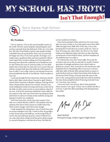 service would ever let them. I have been principal of this school now for seven years, after two tours of duty as Vice Principal in Iowa from 20032006 and again from 2008-2010. Every day, I sit in wait, knowing that if and when my country needs me, I have at least 50 young, spry, often either very short or very lanky bodies at my disposal; bodies who have no idea what that actual horror of wars hold for them, and how mundane all the stuff that isn’t war really is. Yet without fail, every day I must suffer. Every day the recruiters stare me in the eye and ask if I, myself, a human specimen of strength and power, have what it takes to defend my country. They crawl all over the lunchroom with Sisyphean fervor, attempting with no success to convince table after table of theater kids and pep band no-names to wash the Kool-Aid out of their hair and lay their bodies on the line for Dick Cheney. Everyone from the army to the navy to the coast guard has practically force fed my students the same damn pamphlet about Protecting God and Country. I am God. I am country. I am sorry God, I am not you. But to these potential future martyrs I am a god. A lesser one no doubt, but like, a cool one. A god who allows grinding at the Spring formal. Just a little.