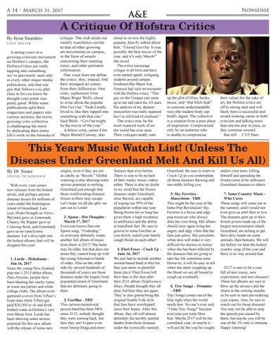 singles, even if they are not as catchy as “Royals.” Global warming is also showing some serious potential in melting Greenland just enough that those world-ending diseases frozen in there may escape. Let’s hope we all die after we jam out to Lorde! 2. Spoon - Hot Thoughts March 17, 2017 Everyone knows that one Spoon song, “Underdog,” so everyone definitely wants another full album of music from them in 2017! The band may be older, but that does not mean they cannot keep up with the young Alternative bands of today. Also on the older side (by several hundreds of thousands of years) are those diseases under the largely Inuit populated island of Greenland that are definitely going to thaw. 3. Gorillaz - TBD This cartoon-turned-real person band has been MIA since 2012; nobody thought they were coming back, but here they are! Expect even more Snoop Dogg and more
