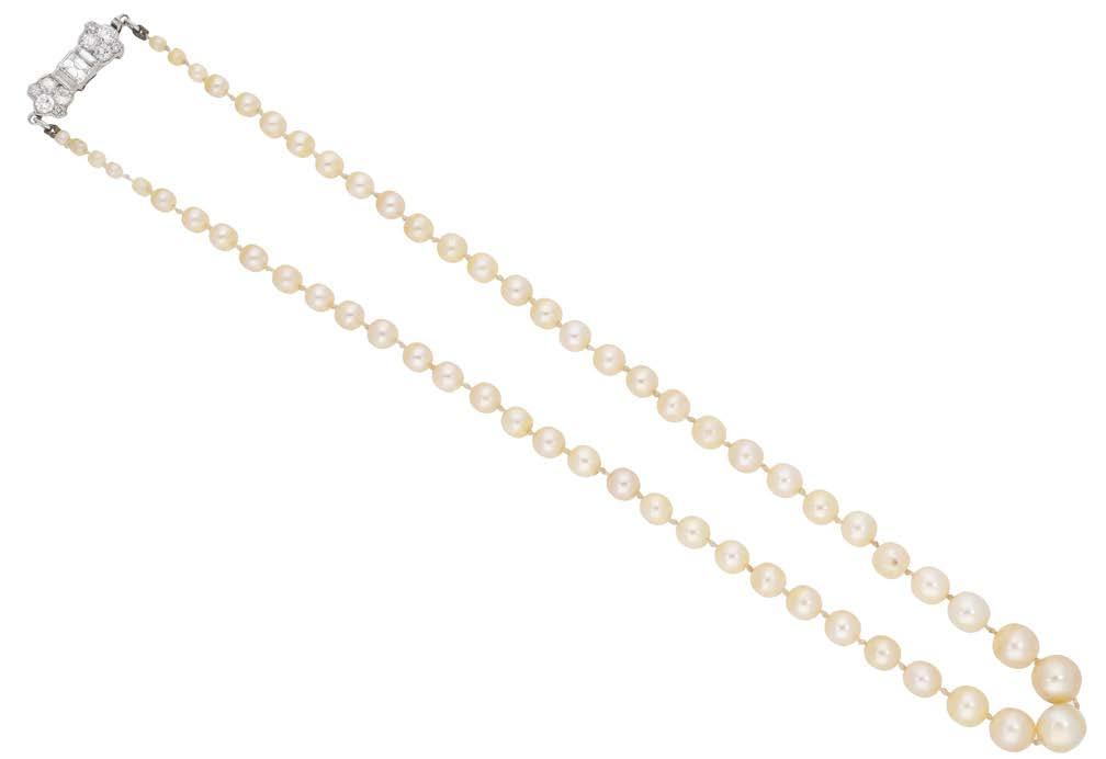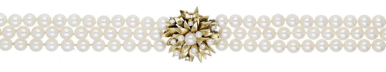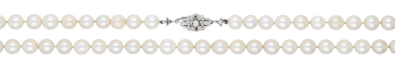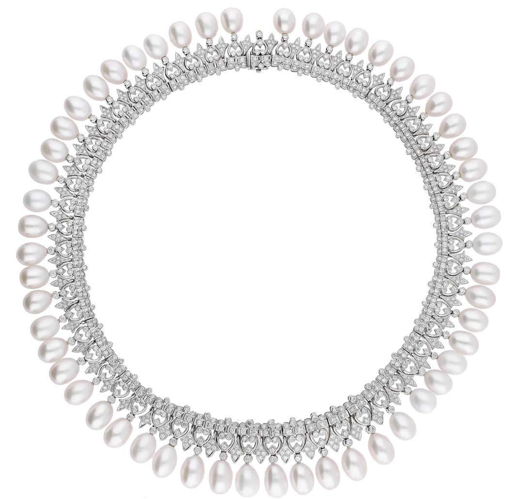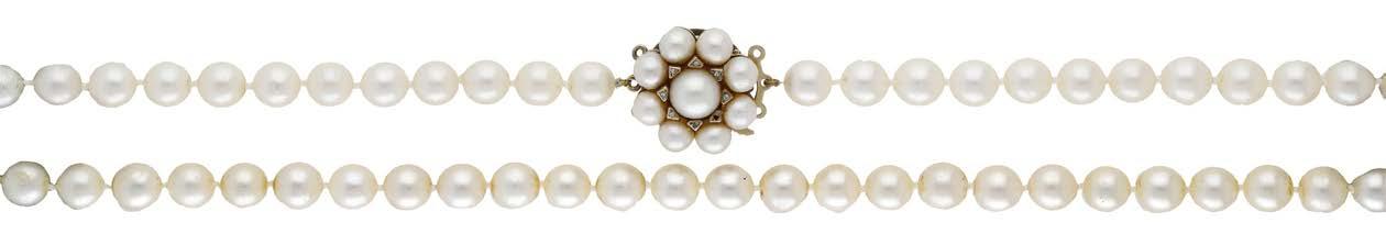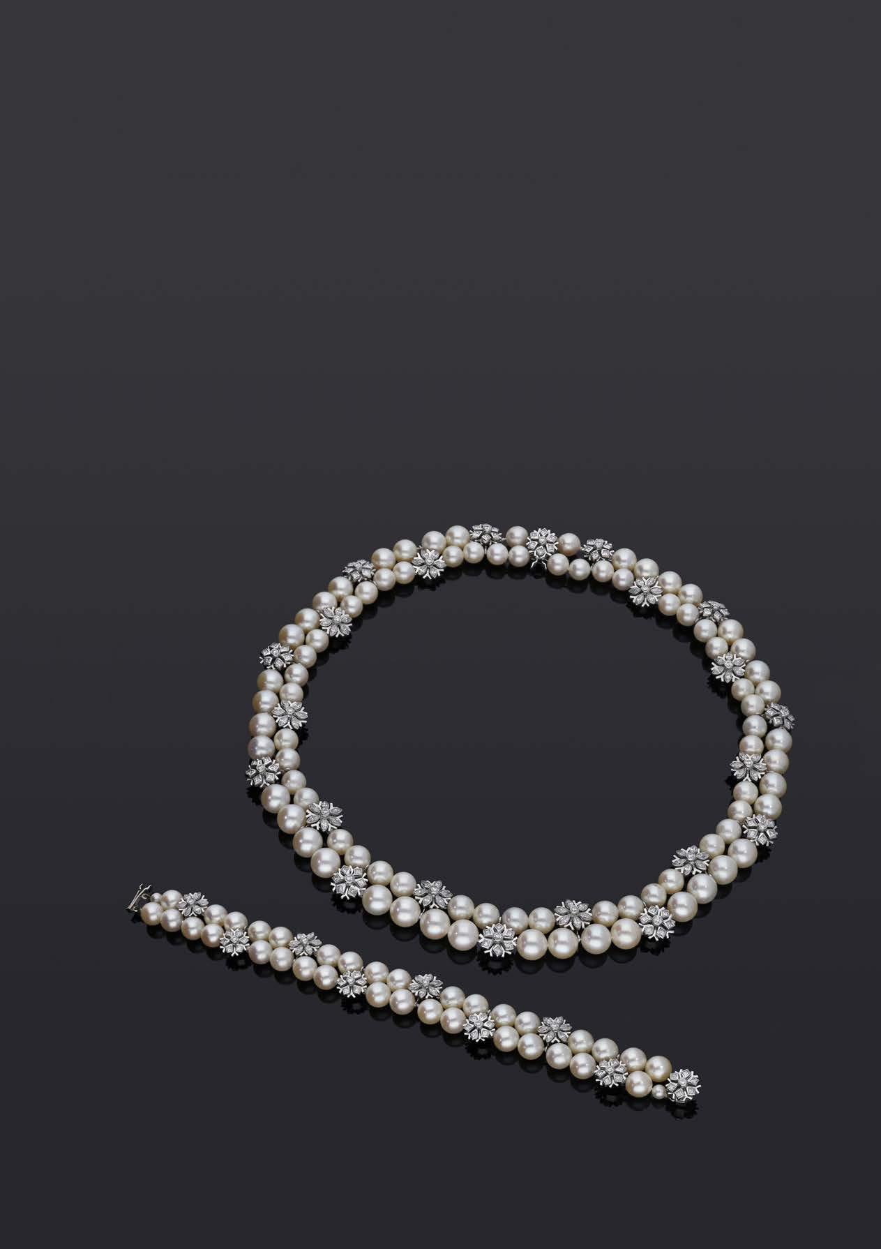 A CULTURED PEARL AND DIAMOND NECKLACE AND BRACELET SUITE BY WILLIAM & SON, 2002, the double row of uniform cultured pearls spaced by owerhead clusters set with marquise, princess and brilliant-cut diamonds, the bracelet en suite, mounted in 18ct gold, London hallmarks, maker’s marks ‘WRA’, retailer’s case, total diamond weight approximately 7.00 carats, necklace length 42.5cm, bracelet 19.5cm. £5,000–£6,000