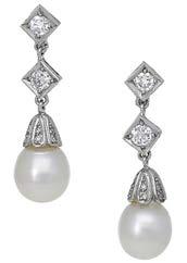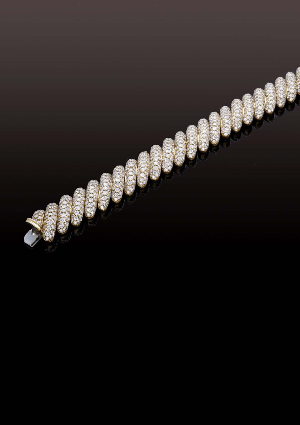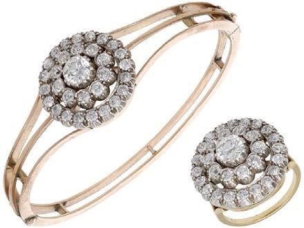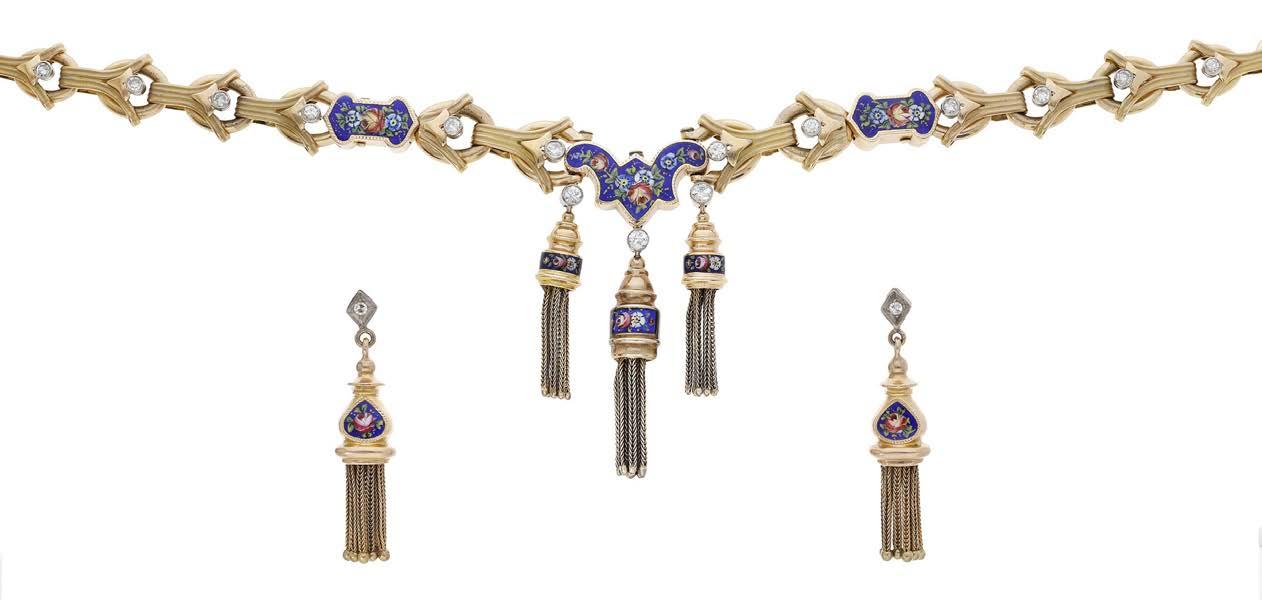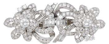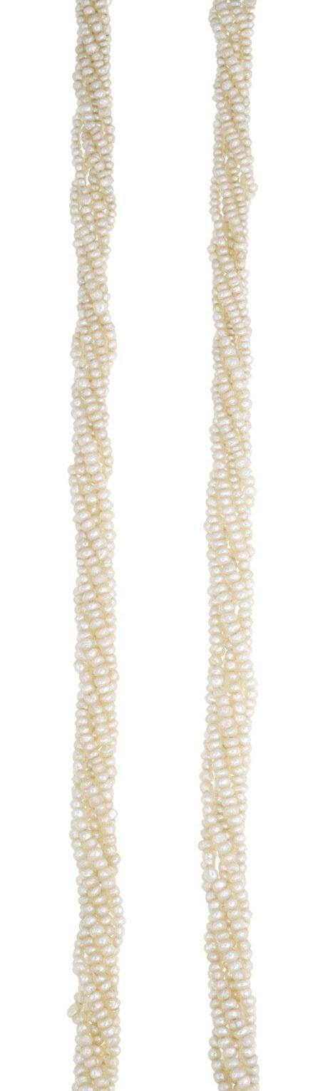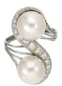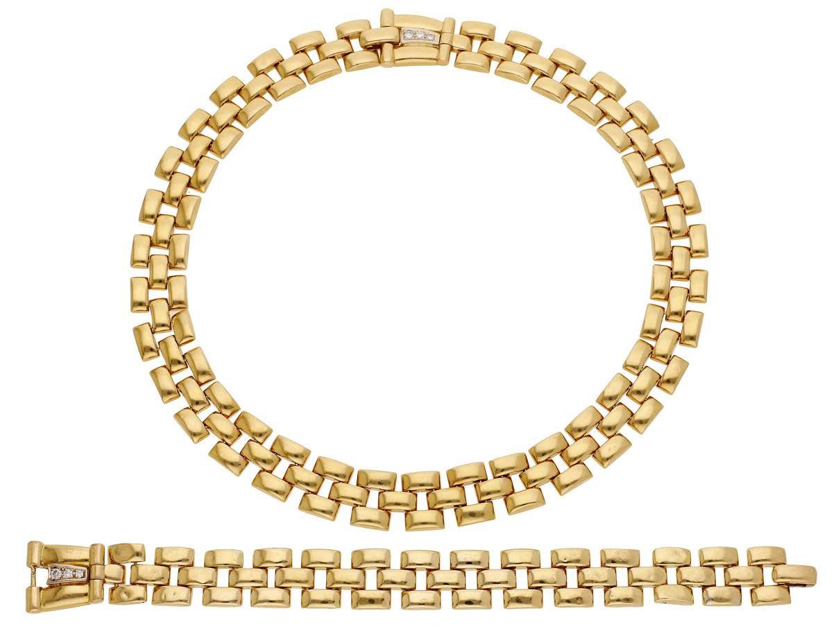 A CULTURED PEARL AND DIAMOND NECKLACE AND BRACELET SUITE BY WILLIAM & SON, 2002, the double row of uniform cultured pearls spaced by owerhead clusters set with marquise, princess and brilliant-cut diamonds, the bracelet en suite, mounted in 18ct gold, London hallmarks, maker’s marks ‘WRA’, retailer’s case, total diamond weight approximately 7.00 carats, necklace length 42.5cm, bracelet 19.5cm. £5,000–£6,000