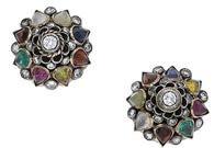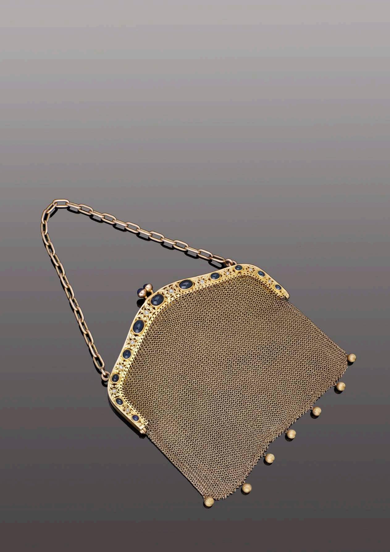 AN ANTIQUE MESH AND GEM-SET EVENING BAG , the pierced gold frame of scroll and foliate design, set with graduated sapphire cabochons and old brilliant-cut diamonds, the meshwork with reeded bead drops below, the thumbpiece set with further sapphire cabochons, total diamond weight approximately 0.30 carat, length 12.5cm