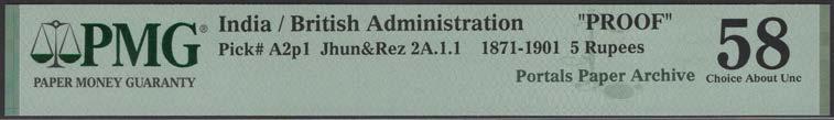 WORLD BANKNOTES 31 AUGUST 2023 AT 10 AM FEATURED COLLECTION LOT 281–345 INDIAN PROOFS AND WATERMARKED PAPERS FROM THE PORTALS ARCHIVE BACK COVER LOT 283 GOVERNMENT OF INDIA A PRINTERS DESIGN FOR 5 RUPEES LAHORE OR CALCUTTA 20 JANUARY 18- (1871) ABOVE LOT 385 BANK INDONESIA 1000 RUPIAH, 1858 REVERSE