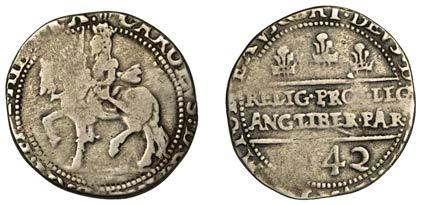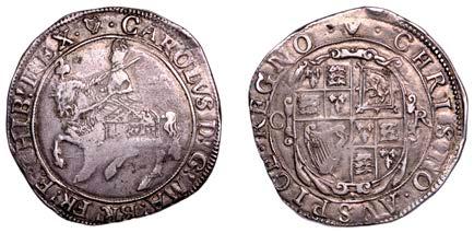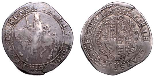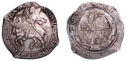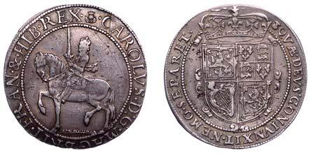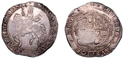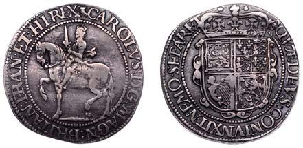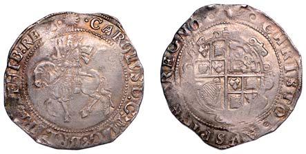 26 x Halfcrown, 1642, mm. plume on obv. only, Shrewsbury horseman, ground line below, no plume in !eld, rev. three plumes above Declaration, date below, 13.24g/7h (Morr. F-4; SCBI Brooker 825; N 2378; S 2934). Somewhat small of an, otherwise ne for issue and reverse better, rare £300-£400