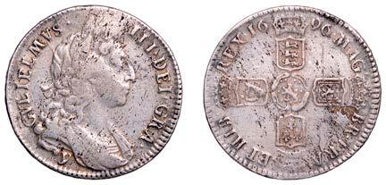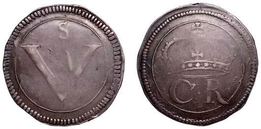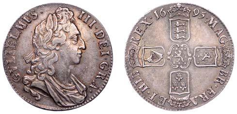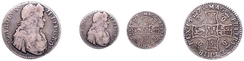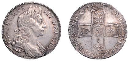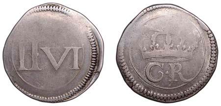 43 x Shilling, 1663, !rst bust, harp with 7 strings (ESC 500; S 3371). About very ne, but with light porosity and uneven patina