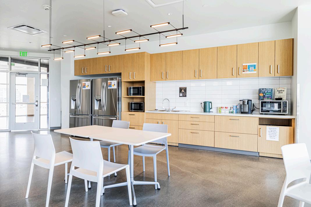 E A mini kitchen/dining area with multiple refrigerators, microwaves, and seating