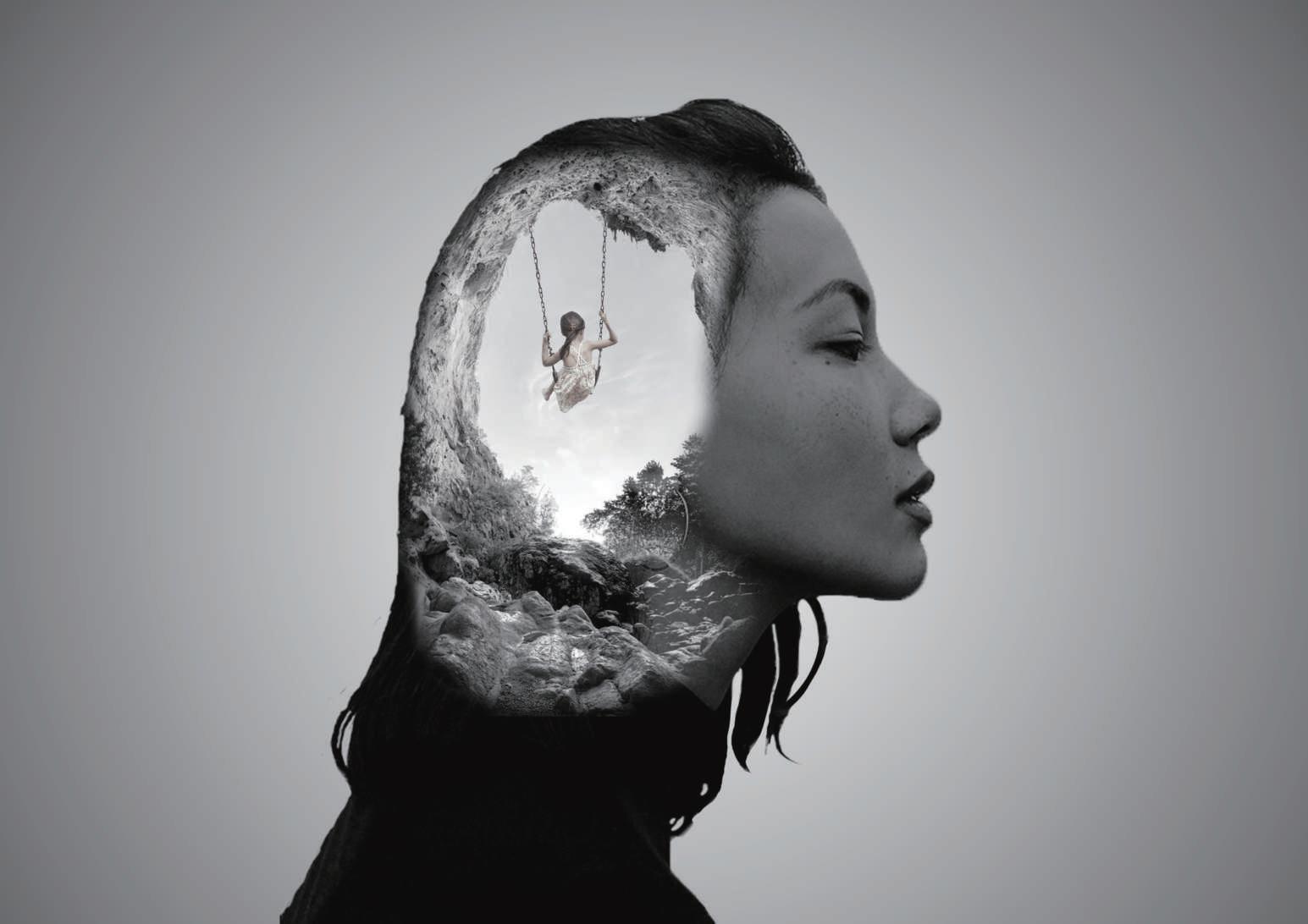 這幅圖像展示了一位女子的側面輪廓,其頭部內部被創意地呈現為一個洞穴,洞穴中有一個 小女孩快樂地盪著鞦韆。這畫面融合了現實與夢幻,喚起人們對記憶和內心世界的思考。