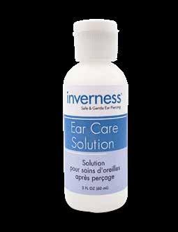 2. Täglich und mit sauberen Händen: a) 3-mal täglich reinigen. Reinigen Sie mit einem Wattestäbchen, das mit einer großzügigen Menge Inverness Care Solution getränkt ist, gründlich die Vorder- und Rückseite des Bereichs um das Ohrloch.