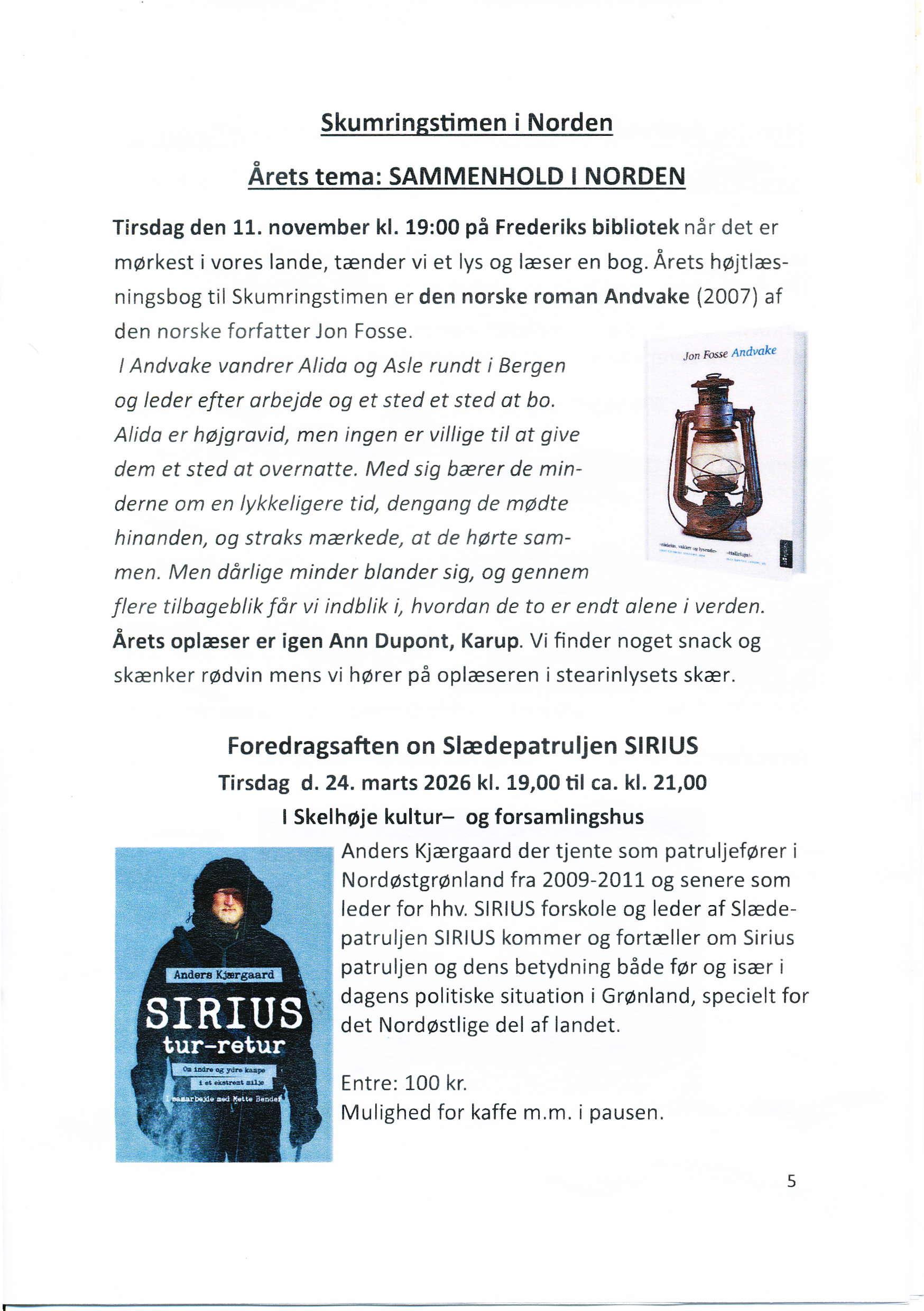 Tirsdag den 11. november kl. 19:00 på Frederiks bibliotek når det er mørkest i vores lande, tænder vi et lys og læser en bog. Årets højtlæsningsbog til Skumringstimen er den norske roman Andvake (2007) af den norske forfatterJon Fosse.