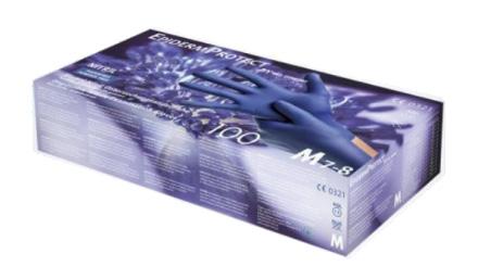 Puderfri, latexfri handske med invändig beläggning av lanolin och E-vitamin för att minimera uttorkning och underlätta påtagning. Helhandsgreppstruktur. Färg: blå Innehåll: 300 st. artnr 66743 medium. Gäller alla storlekar