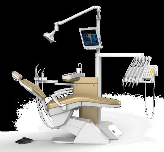 En välutrustad stol med allt du behöver för det dagliga arbetet. Med fem instrument och operationslampa. För vått sugsystem. Premiumpaketet med superskön klädsel i en exklusiv grå nyans.