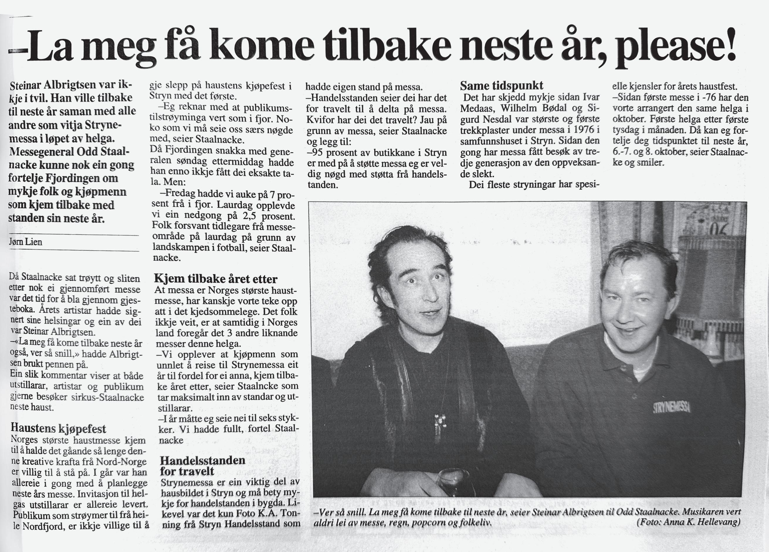 – Strynemesse nr. 48 Arbeidet med å leggje planen for årets messe starta for mange månader sidan, ja eigentleg under fjorårets messe. For å sikre det allsidige, med noko for alle aldrar og alle smakar, må messegeneralen knyte dei første kontaktene tidleg.