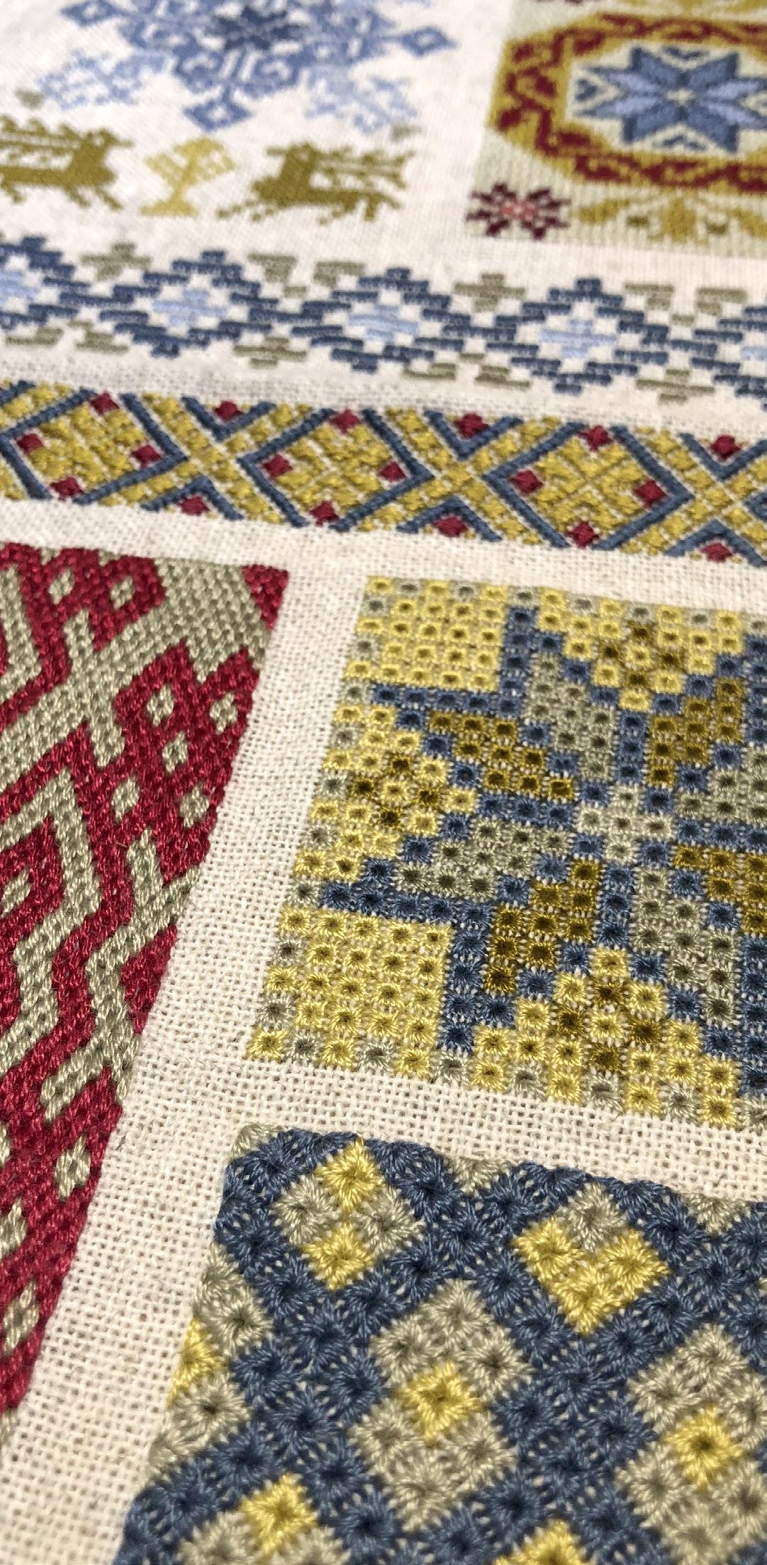 A sampler featuring traditional Icelandic designs, embroidery techniques, and colors, using modern materials including cotton thread and linen fabric. Created for the Traditional Icelandic Embroidery craft class. Design and stitching by Justin Allan-Spencer.