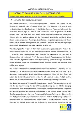 Das Niedersächsische Gleichberechtigungsgesetz befindet sich derzeit in der schriftlichen Anhörung des Sozialausschusses und soll voraussichtlich Anfang 2009 verabschiedet werden. Das Gesetz betrifft die Gleichstellung von Frauen und Männern in den öffentlichen Verwaltungen auf Landes- und kommunaler Ebene. Gegenüber dem bisher gültigen Gesetz von 1994 steht nicht mehr alleine die Frauenförderung im Vordergrund, vielmehr wird ein stärkerer Akzent auf die Vereinbarkeit von Familie und Beruf gelegt. Zudem werden einige starre Regelungen durch flexiblere Ausgestaltungen ersetzt. Zu diesem Gesetz gibt es kritische Stellungnahmen von Seiten der Opposition, die eher die Regelungen des alten auf Rot-Grün zurückgehenden Gesetzes erhalten will. Die Änderung des Niedersächsischen Nichtraucherschutzgesetzes soll in Kürze in den Sozialausschuss eingebracht und bis Dezember verabschiedet werden. Sie beinhaltet die 1 zu 1 Umsetzung des Bundesverfassungsgerichtsurteils zur Möglichkeit des Rauchens in Einraumkneipen mit weniger als 75 m² Gastfläche, ohne die Ausgabe zubereiteter Speisen, ohne Zutritt für Jugendliche und mit einer Kennzeichnung als Raucherkneipe. Alle darüber hinaus gehenden Fragen des Nichtraucherschutzes sollen im Rahmen der Evaluation Ende 2009 erörtert werden. Das Niedersächsische Gesundheitsfachberufe-Gesetz betrifft die Umsetzung von EUVorgaben für die Berufsqualifikationen von Gesundheitsfachberufen, die nicht unter die im September verabschiedete Novelle des Heilkammergesetzes fallen. Mit dem Gesetz soll zudem die Dienstleistungsfreiheit innerhalb der EU gesichert werden. Politisch strittige Punkte gibt es dabei voraussichtlich nicht, daher ist eine zügige Beratung zu erwarten. Das Niedersächsische Wohnraumfördergesetz geht auf die Föderalismusreform zurück, mit der die Verantwortung für die Wohnungsbauförderung auf die Länder überging, verbunden mit einer zweckgebundenen Zuweisung der bisherigen Bundesmittel. Gegenüber den noch fortgeltenden bundesrechtlichen Regelungen sollen mit dem eigenen Landesgesetz Gestaltungsspielräume erweitert und Verwaltungsabläufe vereinfacht werden. Schwerpunkte sind die Eigentumsförderung für Familien mit mehreren Kindern, die Förderung des Baus von Mietwohnungen mit Belegungsbindung insbesondere für größere Familien, Senioren und Menschen mit Behinderungen sowie die Förderung der energetischen Modernisierung von