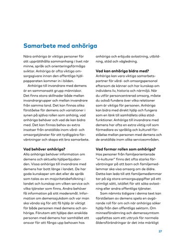 Samarbete med anhöriga Nära anhöriga är viktiga personer för att upprätthålla sammanhang i livet när minne, språk och orienteringsförmåga sviktar. Anhöriga är ofta viktiga omsorgsgivare innan den offentliga hjälpapparaten kommer in i bilden. Anhöriga till invandrare med demens är en sammansatt grupp människor. Det finns stora skillnader både mellan invandrargrupper och mellan invandrare från samma land. Det kan finnas olika förståelse för demens och variationer i synen på själva rollen som anhörig, vad anhöriga behöver och vad de kan bidra med. Det kan finnas behov av extra insatser från anställda inom vård- och omsorgstjänster för att tydliggöra förväntningar och skapa ett bra samarbete.