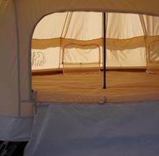 Geräumige und leichte Baumwollzelte, gefüllt mit weichen Decken, Kissen und Laternen mit Kerzenlicht, die sich in einem Spiegel auf dem Nachttisch spiegeln. Du wachst in einem weichen, kuscheligen Bett und ohne den durch Tannenzapfen verursachten Muskelschmerz auf.