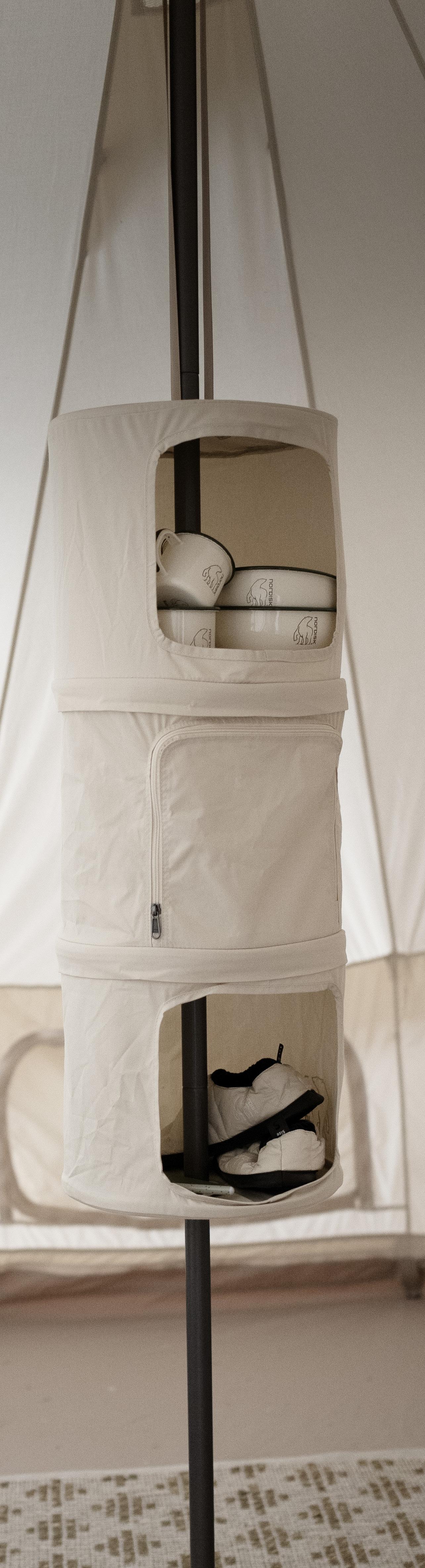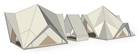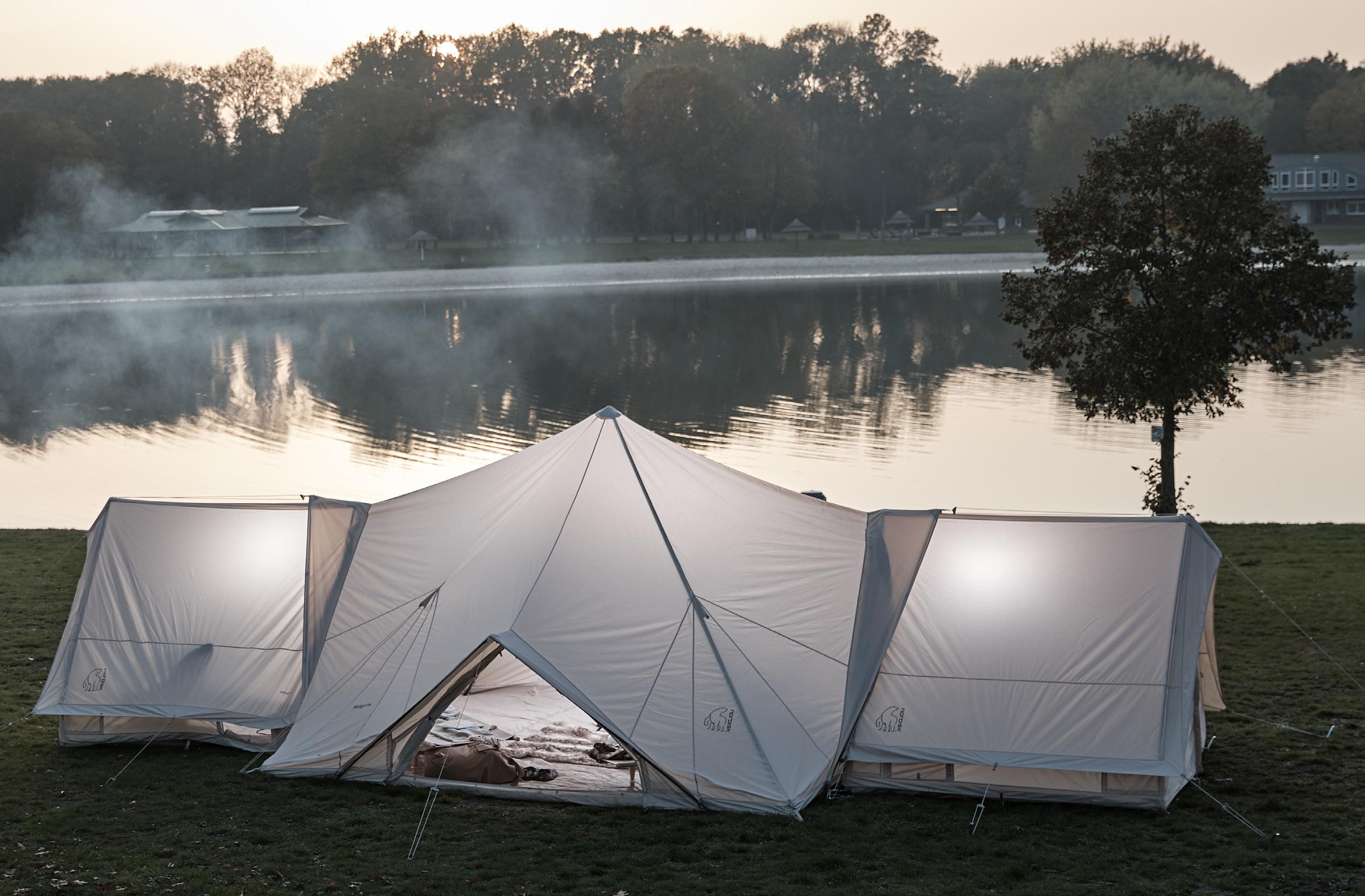 Tents and inner cabins alike are designed to offer comfortable stand-up height and optimal light conditions to inspire energy and reflect the rhythm of the day. You will find gear loops in the ceiling that can also be used to attach sleeping cabins for added privacy and room division.