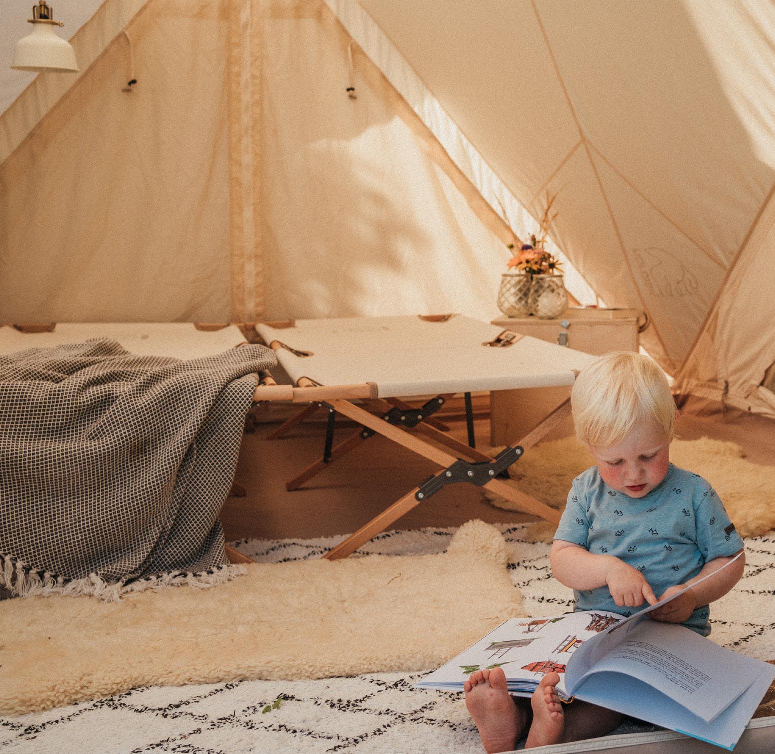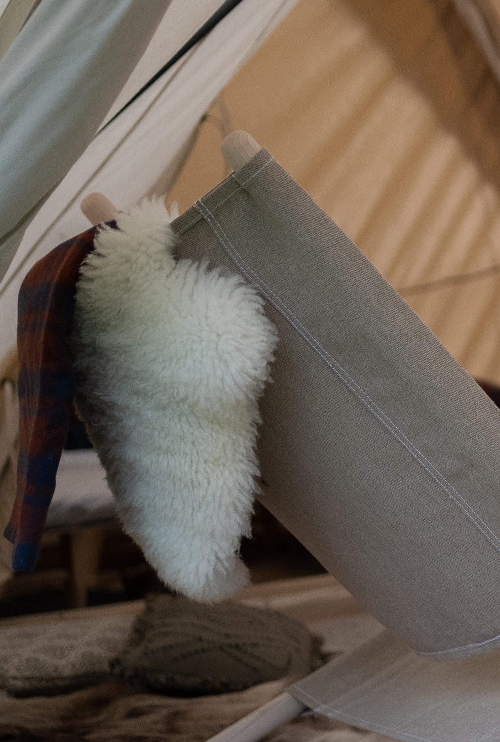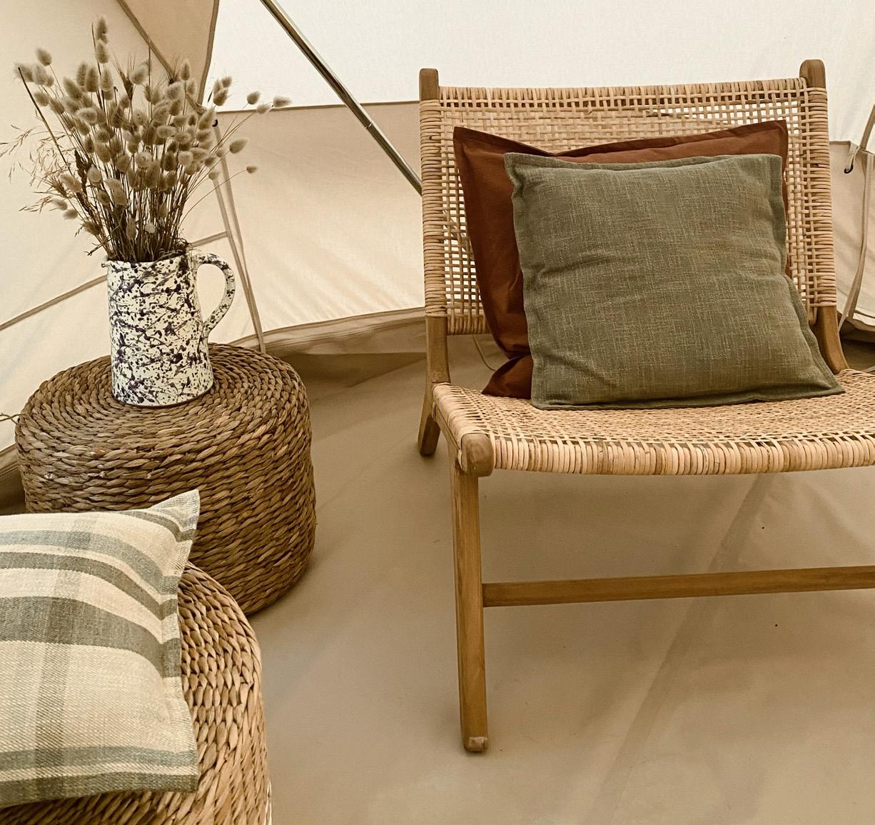 Find a small carpet, some lovely plaids and pretty cushions. This is where you can really play with your personal style and put your touch on your glamping tent.