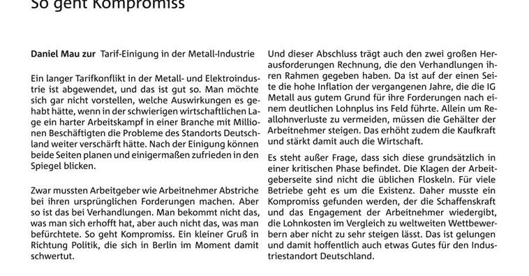 Nach 18-stündigen Verhandlungen haben sich die Arbeitgeber der Metall- und Elektroindustrie mit den Gewerkschaften in der vierten Gesprächsrunde auf einen neuen Flächentarifvertrag geeinigt. S. 6