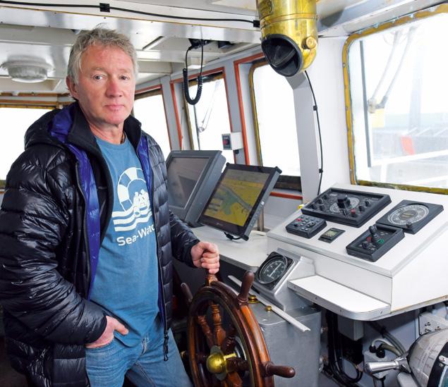 Ingo Werth steuert Richtung Mittelmeer, um mit der „SeaWatch 2“ Flüchtlinge aus Seenot zu retten. Der Trawler wurde auf der Hamburger Pella Sietas Werft eigens dazu umgebaut. S. 10